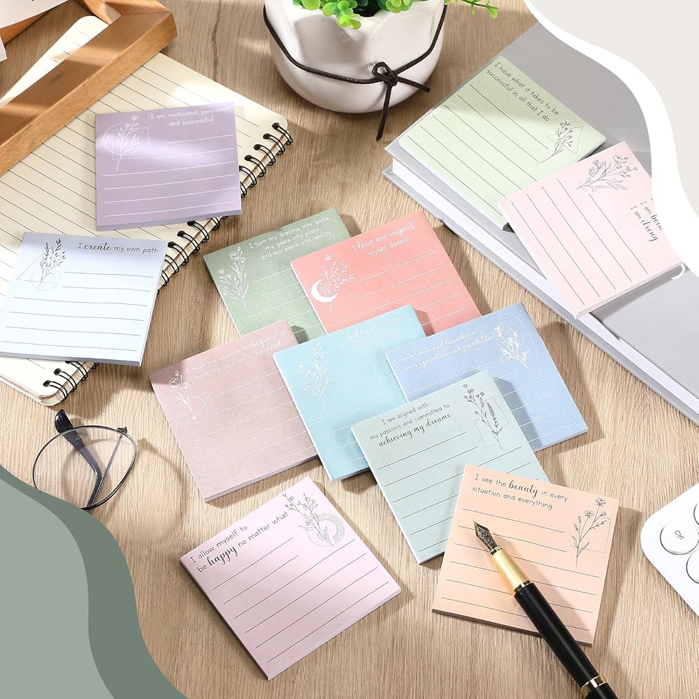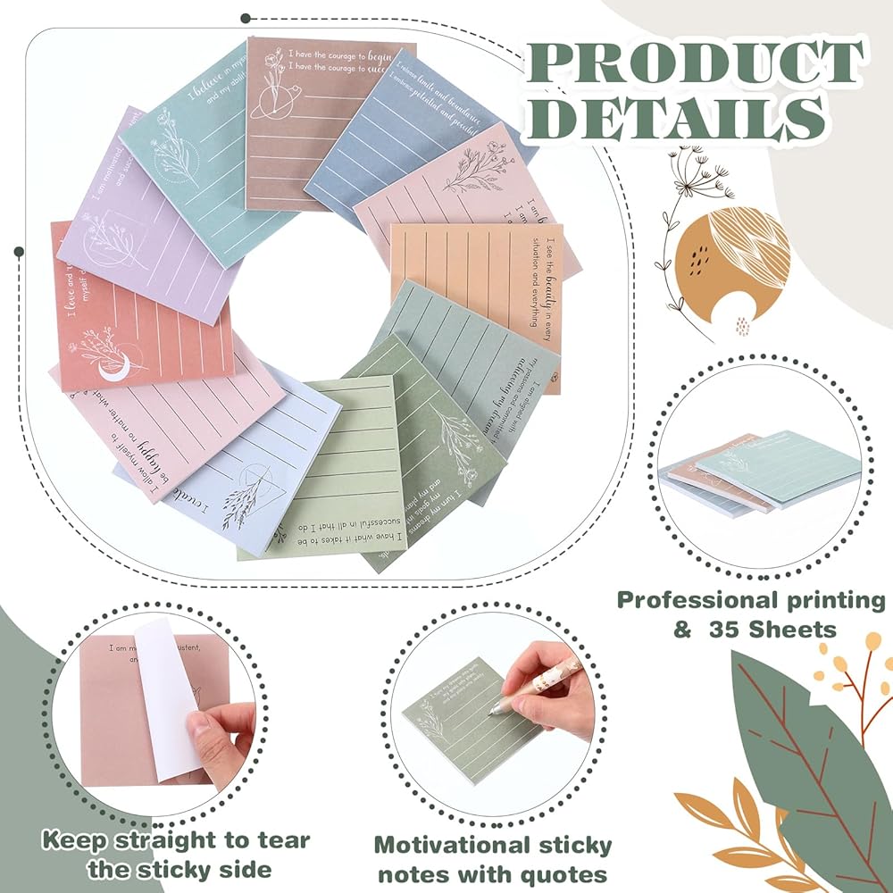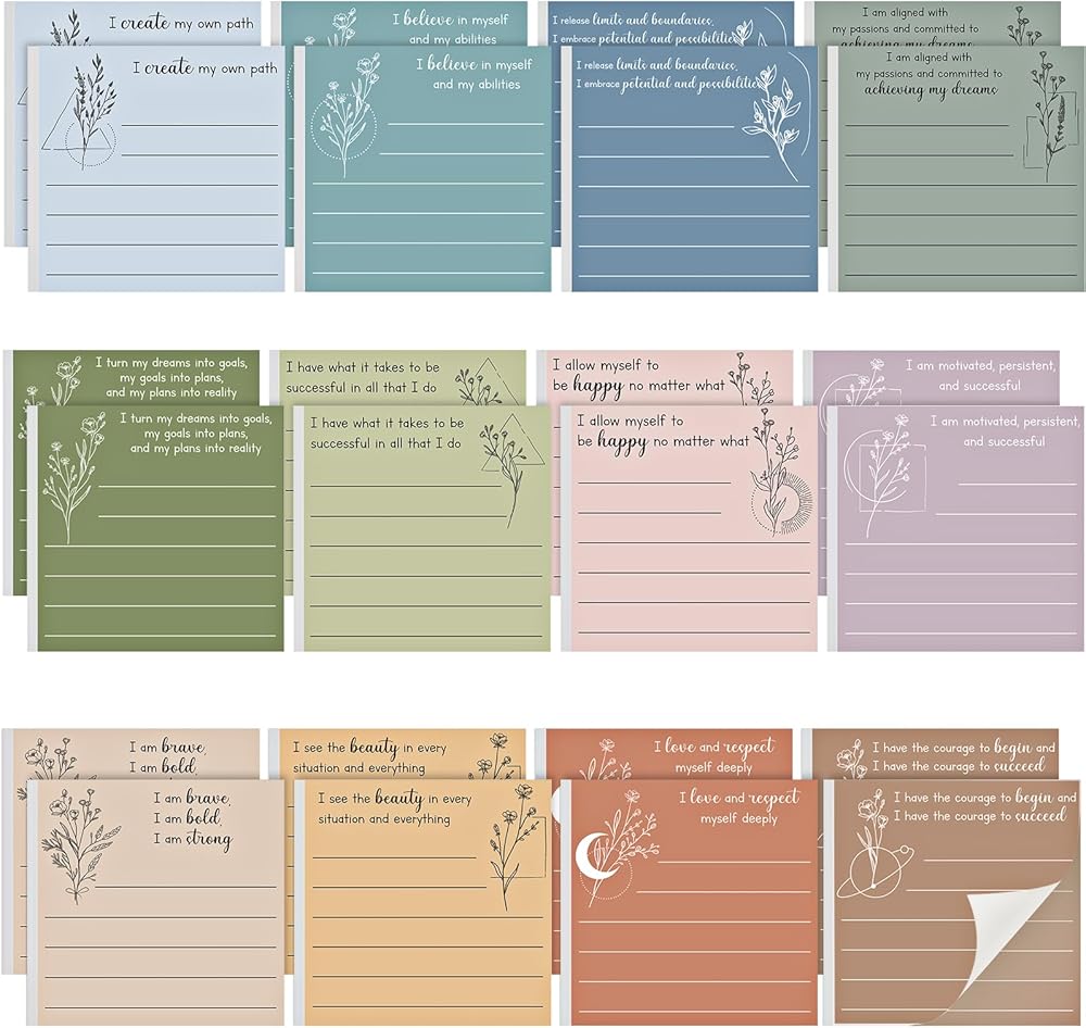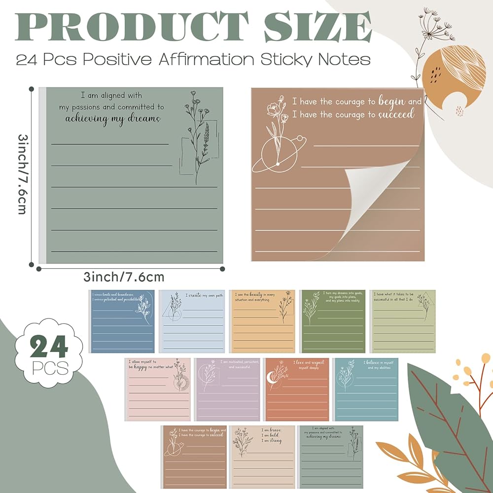 • Generous Package: each package includes 24 affirmation sticky notes with 12 different styles; You'll always have an inspirational sticky note at hand whenever you need to write down thoughts, reminders, or affirmations to motivate you throughout the day
