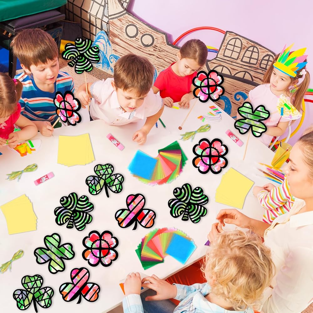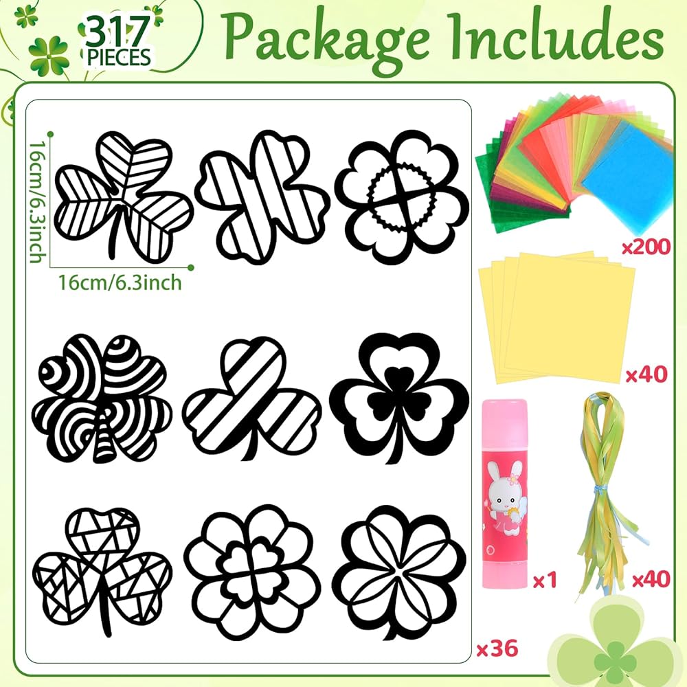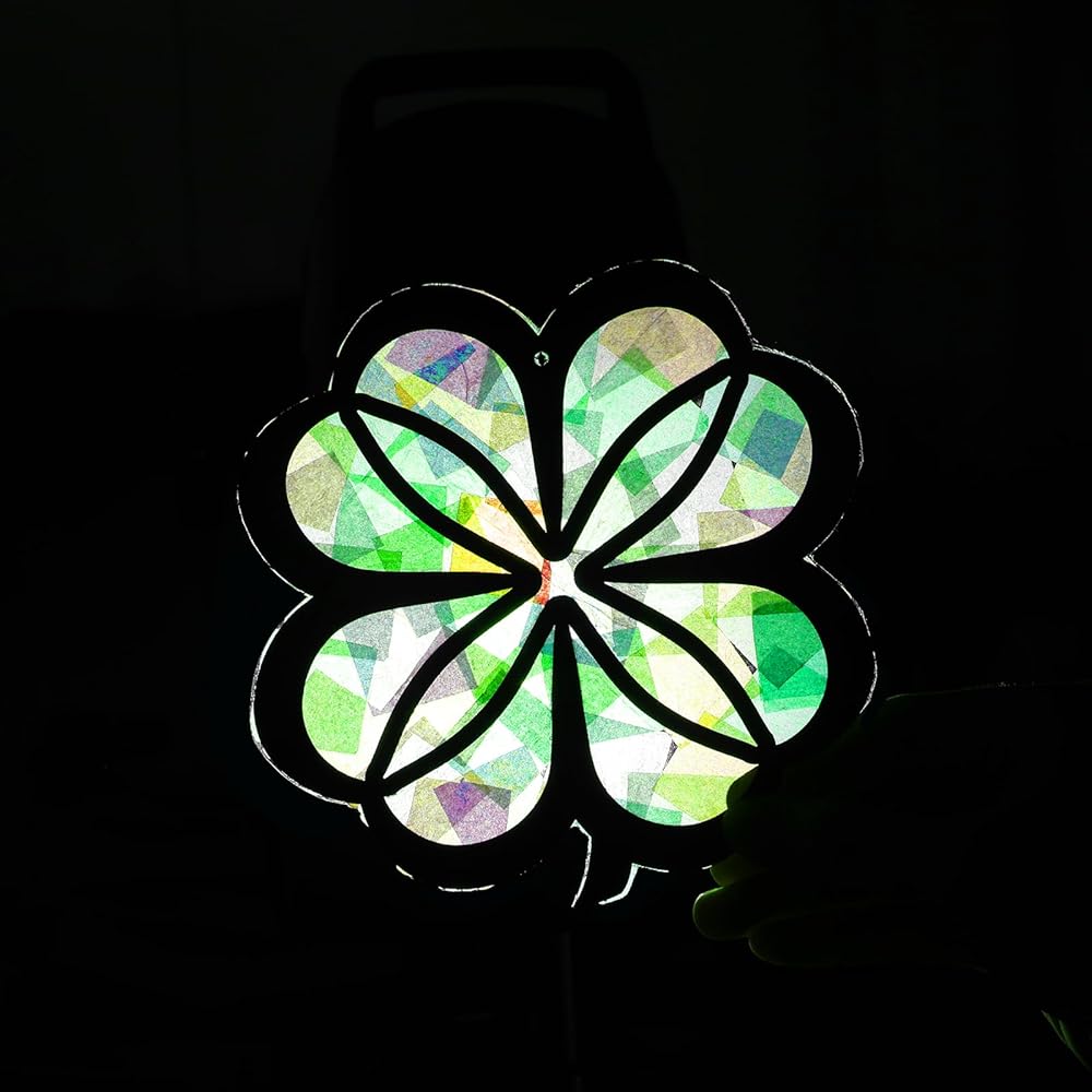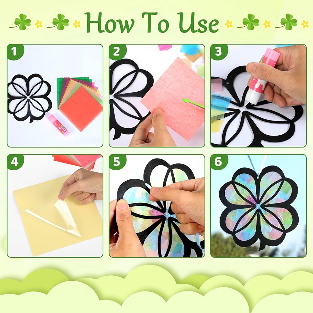 • 【Easy to Operate】The Saint Patrick paper suncatcher kit includes pre-cut shamrock templates, making it effortless to operate. And the tissue paper is easy to work with, allowing you to cut or tear it into small pieces to create unique designs on your suncatchers. With these DIY art craft stuffs, you can dive right into the crafting process, saving you time and allowing you to focus on the fun and imaginative part of the project.