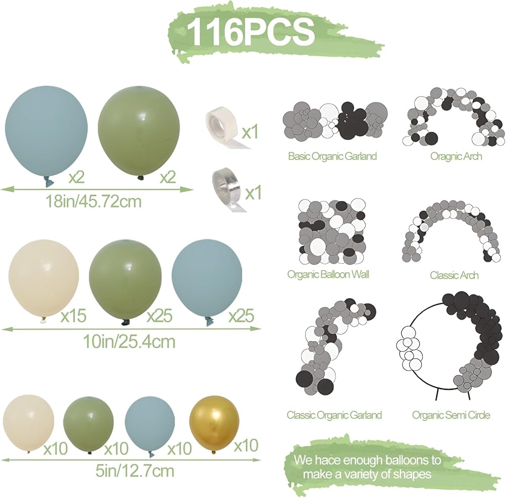 ✨【 البالونات الزرقاء المتربة】 رائعة من مجموعات البالونات الزرقاء والخضراء المتربة تشمل بالونات الضباب الضباب الزرقاء (18in*2،10in*25،5in*15) ، بالونات الرمال البيضاء (10in*15،5in*10) ، بالون الزيتون (18in*2،10in*25in*10) ، 5in*10pc metallic goldic chian.1pc balloon. Dot Glue ؛ Sage Green and Blue Balloons مناسبة للاستحمام الطفل Boho Bridal Shower Wedding Supplies.