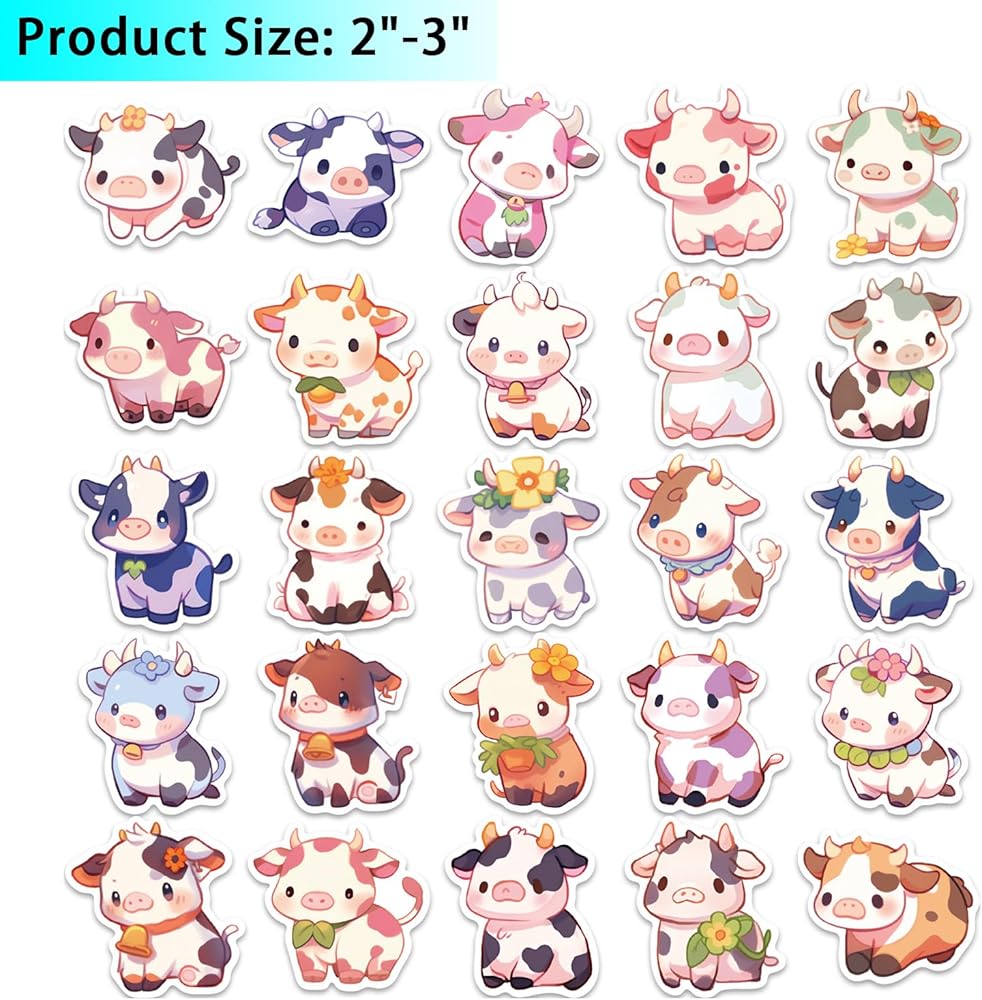150Pcs Cute Cow Stickers, Waterproof Vinyl Decals Kawaii Animal Stickers for Kids Teens, Water Bottle, Laptop, Luggage , Helmet, Skateboard, Guitar, Scrapbook