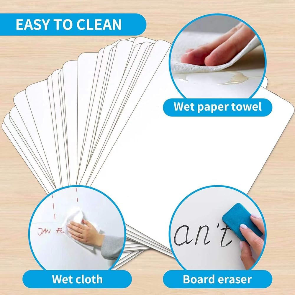 التطبيق الواسع: إن اللوحة الجافة المسح ليست مفيدة فقط في الفصل الدراسي ولكن أيضًا في المنزل والمكتب. يمكن استخدام اللوحات البيضاء الشخصية من قبل الطلاب لممارسة مشاكل الرياضيات أو الكلمات الإملائية. كما أنها مفيدة لكتابة الملاحظات والأعمال المنزلية والأنشطة والأهداف والمهمة ، والتي يمكن محوها وتحديثها بسهولة. يمكن استخدامها في إعدادات مختلفة مثل المطبخ أو المكتب أو لأغراض الترفيه.