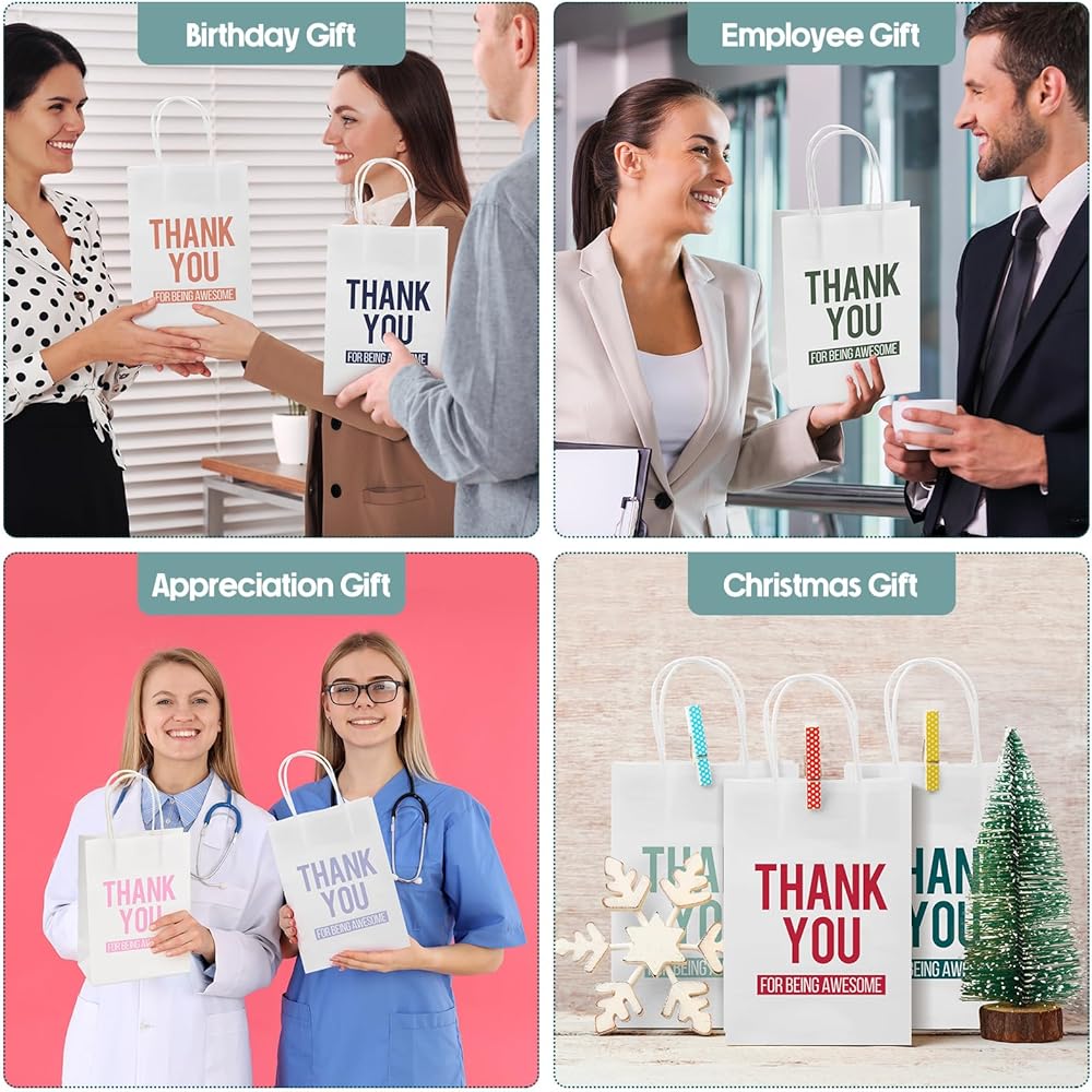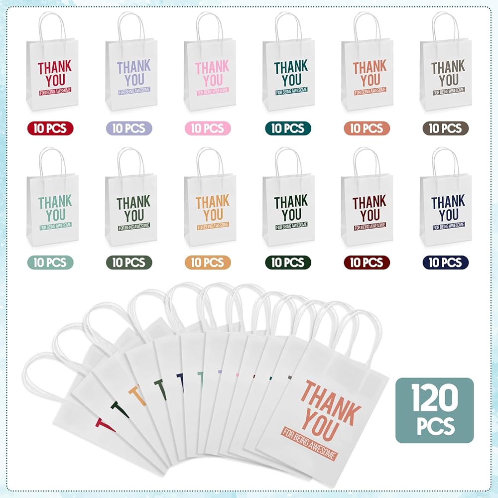 120 Pack Paper Gift Bags: you will get 120 pieces of white handle gift bags, each gift bag is printed with THANK YOU FOR BEING AWESOME; There are 12 colors patterns in total, 10 pieces for each color pattern; The quantity is sufficient to meet your daily needs