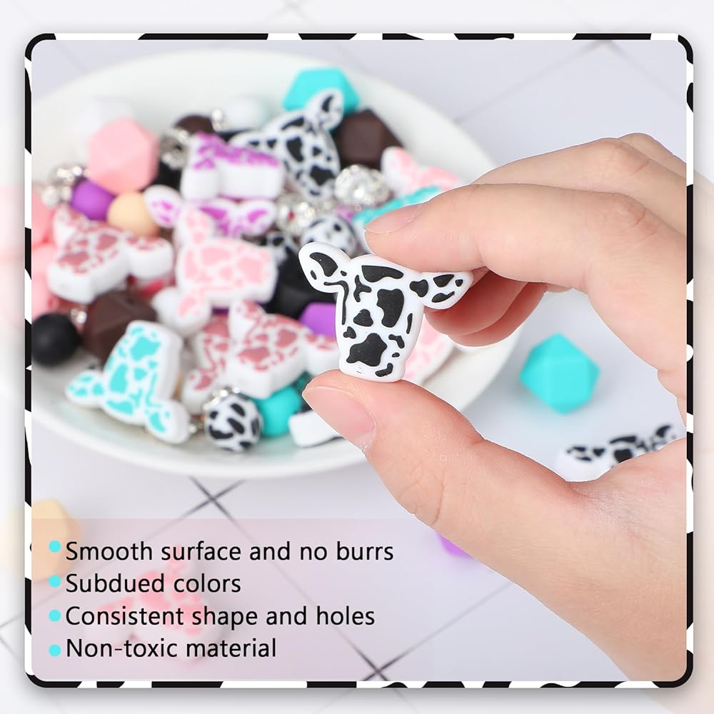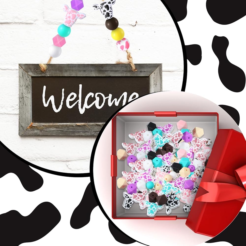 Barydat 100 PCS Silicone Beads - Plk Cow Print Round Hexagon Bocal Colorful Animal Beads لعيد الميلاد DIY سوار القلادة