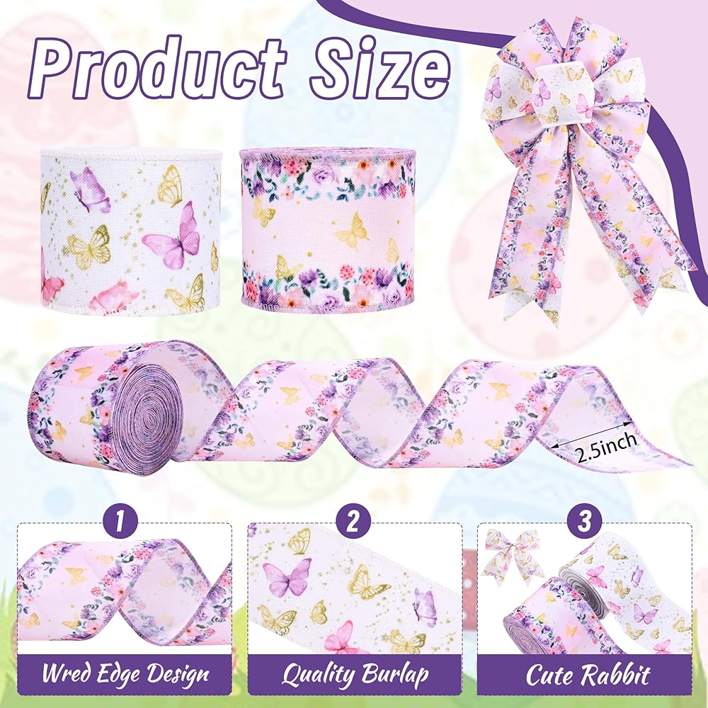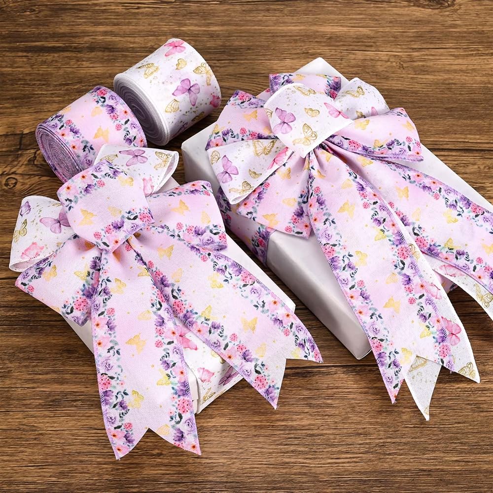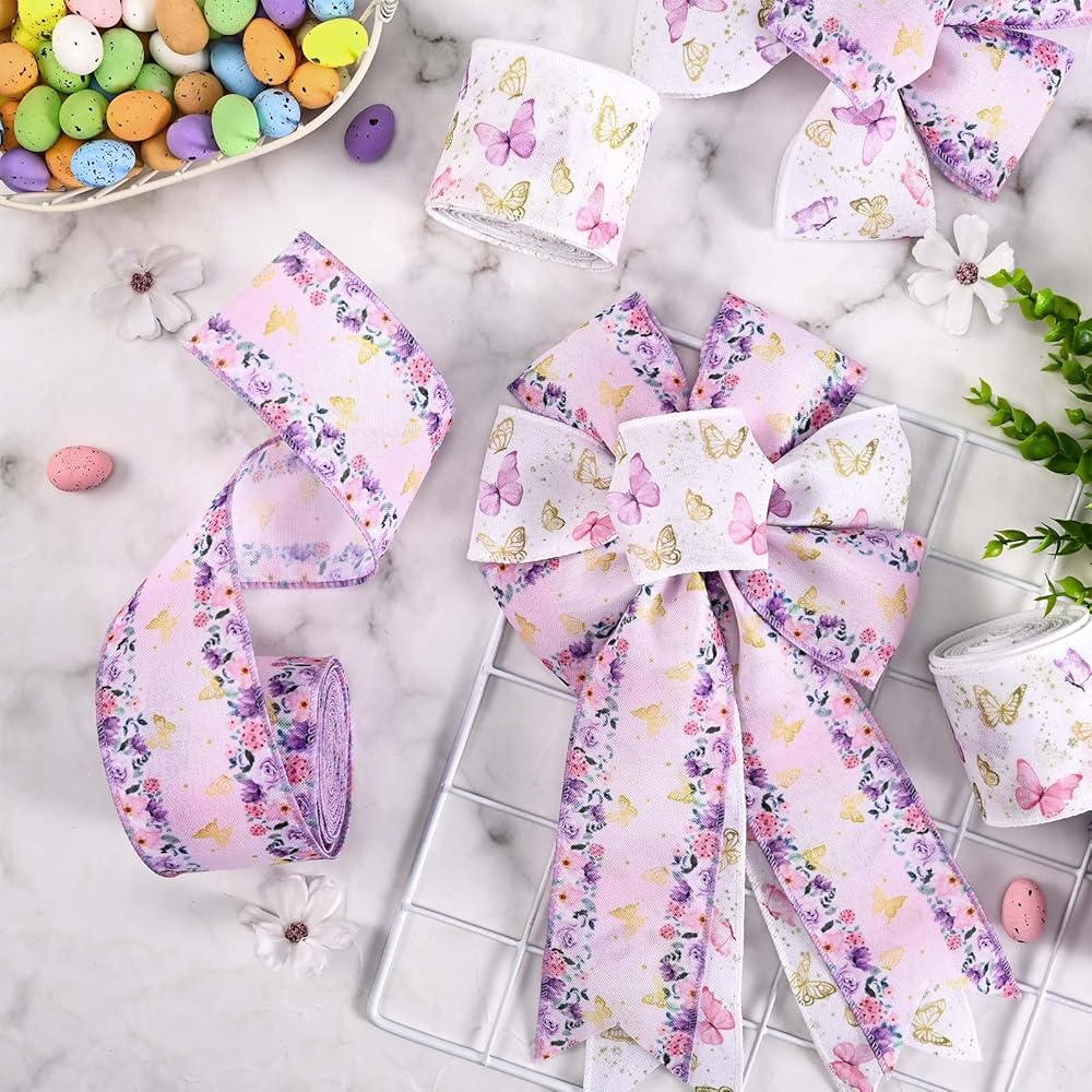 Sanixin 2 Rolls Butterfly Ribbon Violet Butterfly Plaid Burlap Ribbon Spring Ribbon for Easter Spring Crafts Wreaths Wrapping Bow Gifts Box DIY Crafts Decor