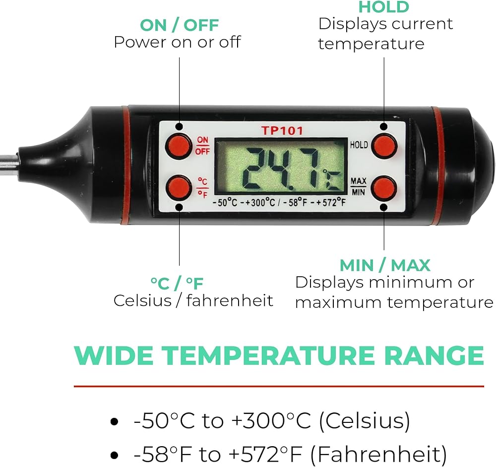 • SAFE OPERATION: With a 5.8” inch long prong, you can measure the temperature whilst keeping your fingers far away from the heat source, making it easy to use the thermometer without injury!