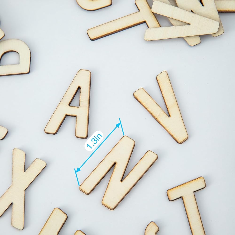 • MATERIAL:1.3 inch wooden craft letters made of high quality poplarwood, strong and durable, the surface and edges are carefully polished and smooth and burr-free, don't worry about hurting your hands when using, each wooden letter is 1.3 inch tall and 2.5 mm thick,size fits most craft projects