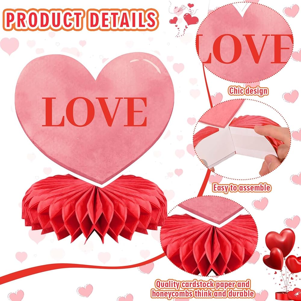 Quality Material: The Valentine's Day honeycomb centerpieces are crafted from thick card stock, smooth, waterproof, and tear-resistant to endure longer. Your sweetheart, family, friends and more are bound to sense your love with this Valentine's Day honeycomb centerpiece.