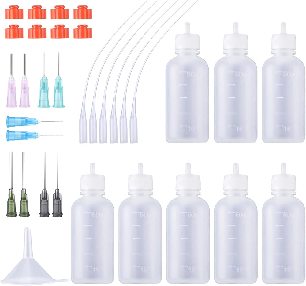 【من السهل استخدام punnels أن تسهل ملء الزجاجات بالطلاء أو الزيت. تساعد أغطية الطرف العلوي للإبر في إغلاق السائل بشكل جيد ويقوم بعمل جيد لمنع الغراء أو الجفاف أو التسرب.