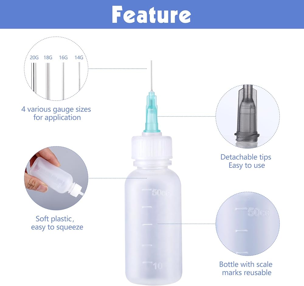 【زجاجة الغراء الدقيقة】 مصنوعة من البلاستيك الناعم ، وسهلة الضغط مصممة للخطوط الدقيقة وتوزيع السوائل الرقيقة مثل الغصين والأحبار والدهانات والزيوت.
