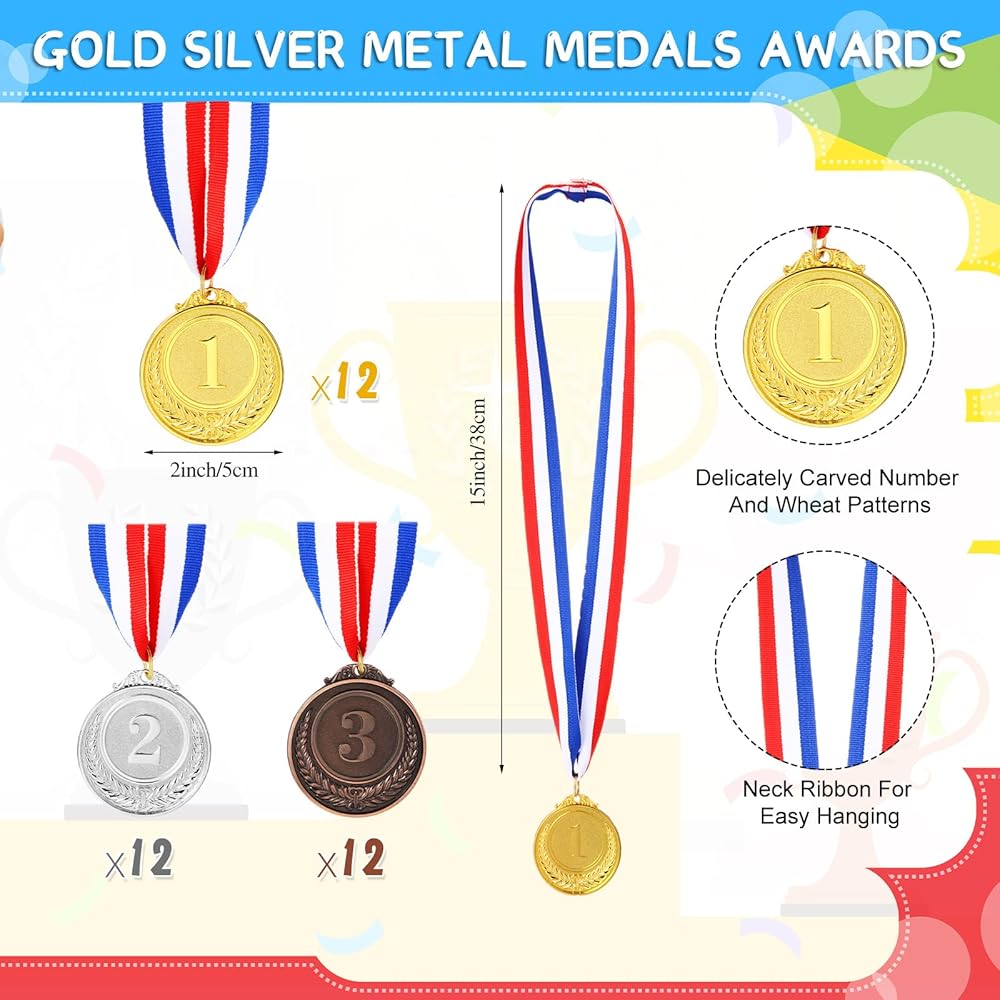 • Quality Materials: these gold, silver, and bronze medals are made of sturdy zinc alloy material, will not fade or break for a long time; They are designed with numbers and leaf patterns, beautiful and easy to identify; These 1st 2nd 3rd ribbons are made of satin material and printed with hot stamped gold letters; The activity card is firmly fixed to the back of the ribbon for recording activities and winners' names, and it comes with a gold rope to display the prize for easy hanging and display