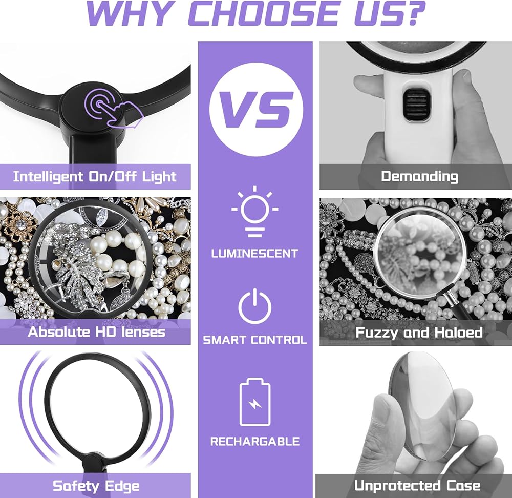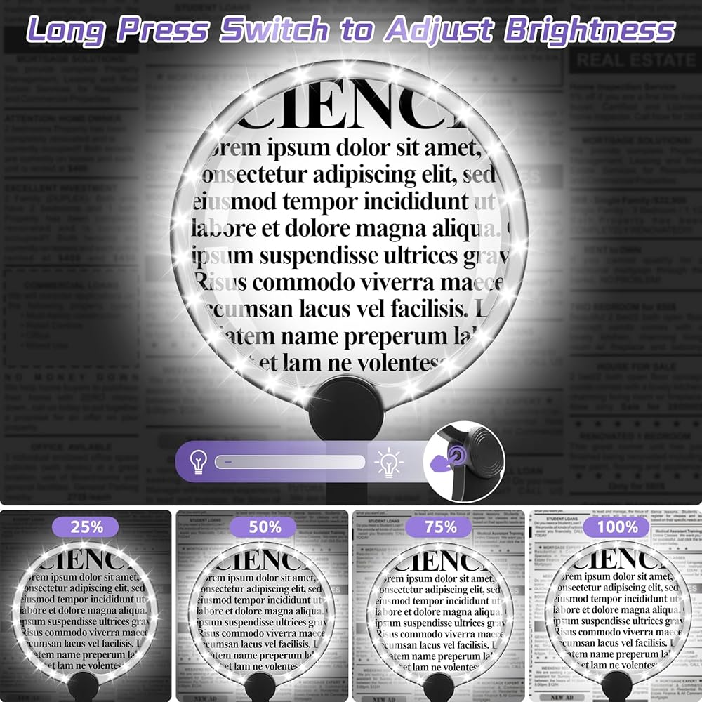 السطوع القابل للتعديل: المكبرات الخالية من الأيدي مع 24 مصابيح LED مدمجة ، مفتاح الدفع الطويل لضبط السطوع ، والتكيف مع بيئات مختلفة ، يقلل بشكل فعال من التعب العين ، بحيث يمكنك القراءة بشكل مريح في بيئة الضوء الخافت والناعم