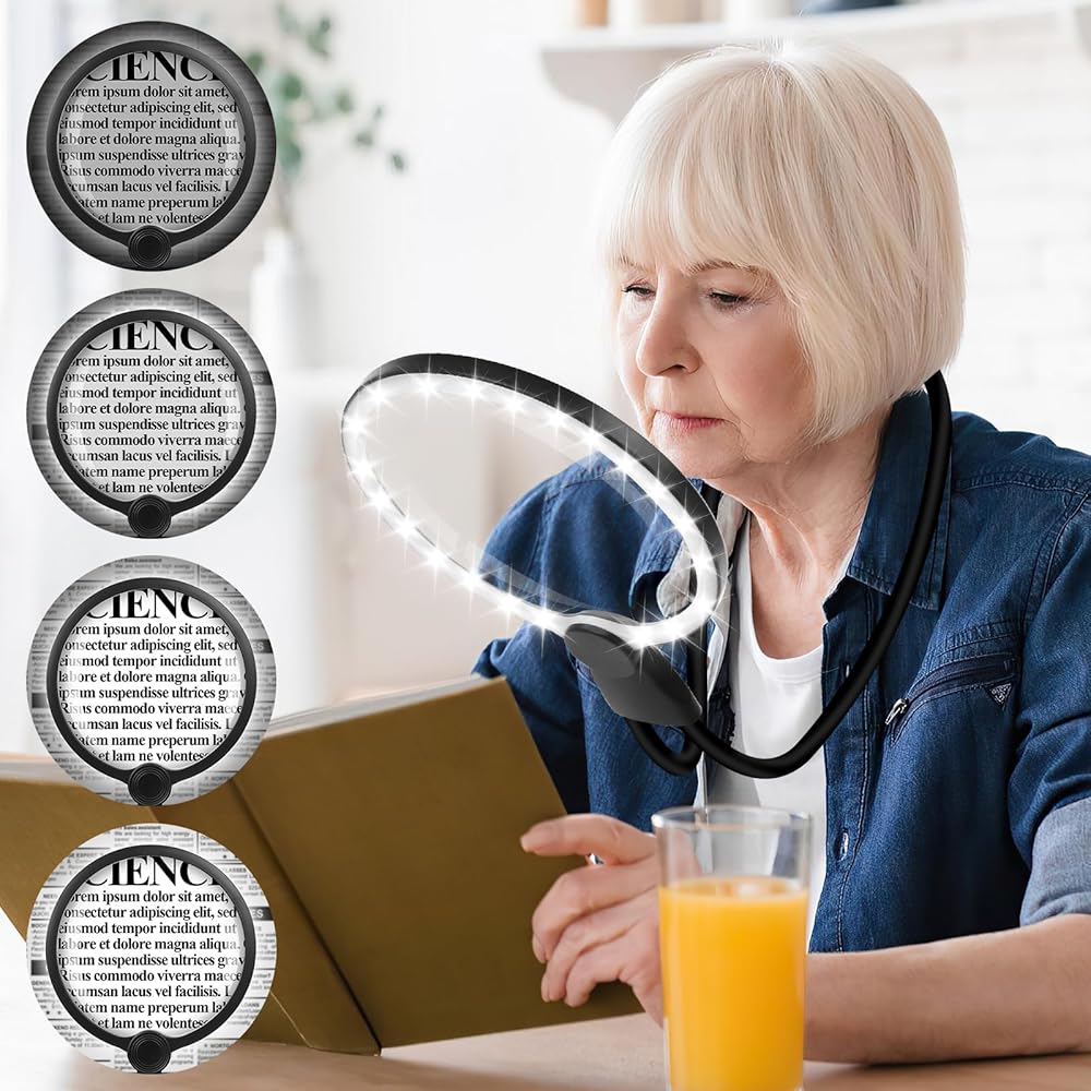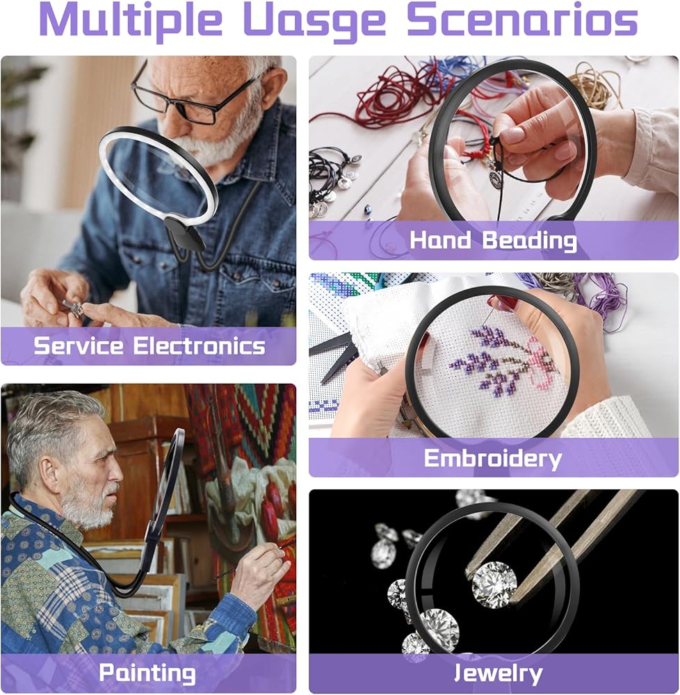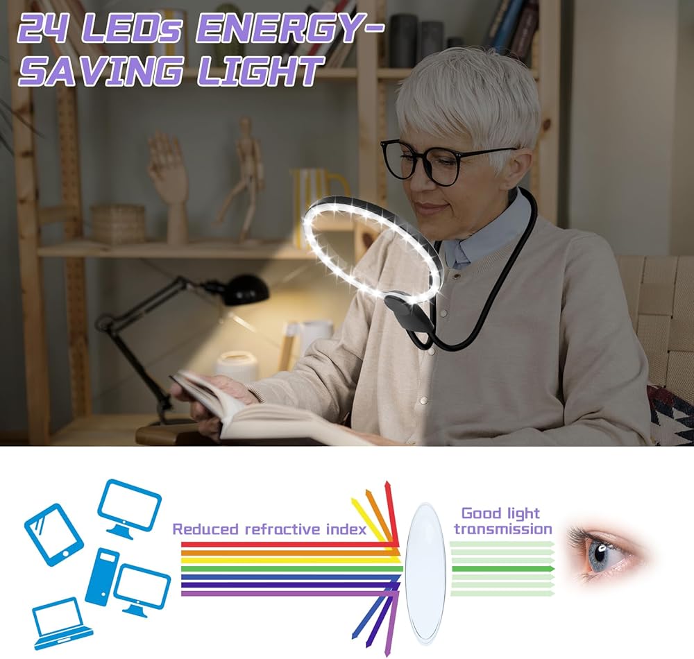 3 in1 machifier: يتيح لك Groencheck المرنة تحرير يديك. ليس فقط يمكن تعليقها على الرقبة لضبط الاتجاهات والارتفاعات المختلفة ، ولكن يمكن أيضًا وضعها على الطاولة. حتى لو كنت تستخدمه لفترة طويلة ، فلن تشعر بالتعب. إنها مناسبة جدًا للقراءة ، والخياطة المتقاطعة ، والإصلاح ، وما إلى ذلك
