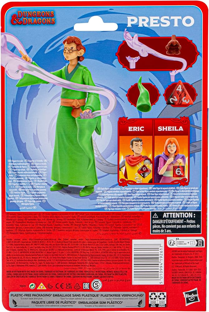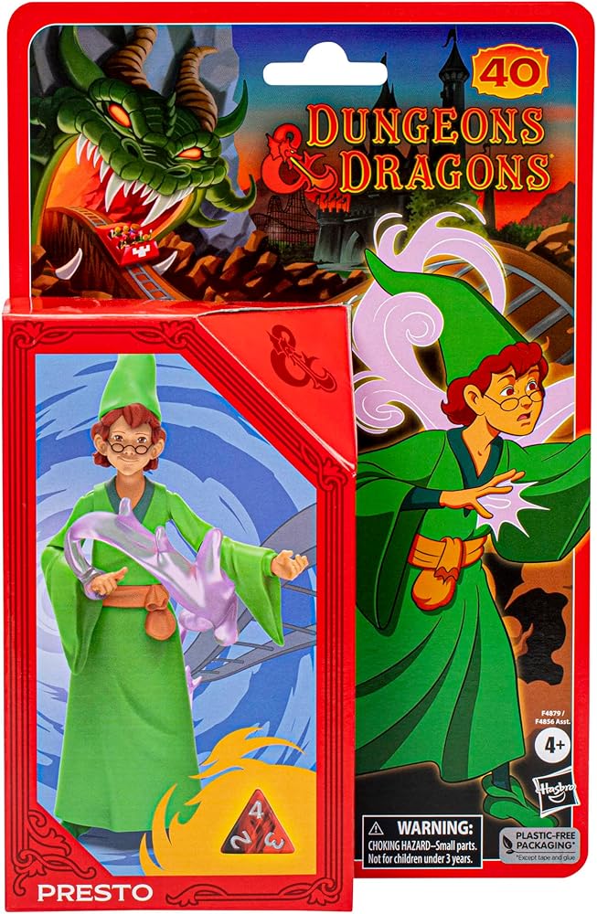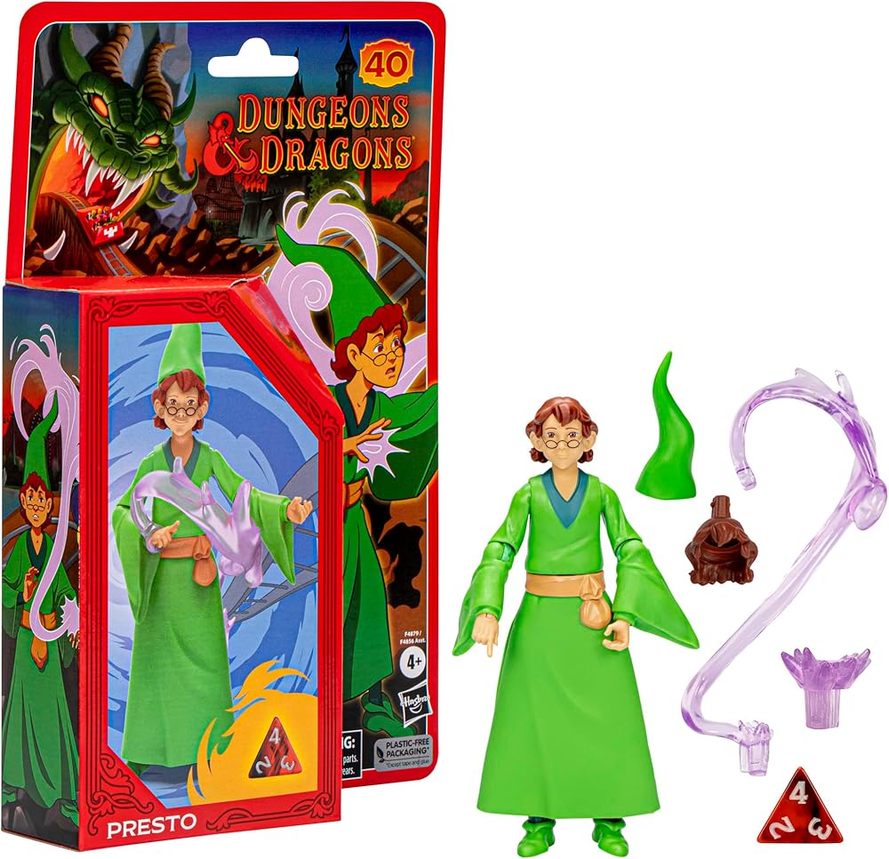 This Presto action figure contains magic hat and magic blast effect accessories and a d4 that's exclusive to this Cartoon Classics figure. With packaging inspired by the original cartoon artwork, these collectible figures will look great on your shelf, in or out of the box. Hey, look! A Dungeons & Dragons toy! These 6-inch-scale Cartoon Classics figures will have you saying “Wow, neat!” before you're figuratively transported to realms of danger and adventure (because imagination!)… and these collectible figures are transported to your shelf by you buying them and bringing them home. TM & ©2023 Wizards of the Coast LLC Hasbro and all related terms are trademarks of Hasbro.