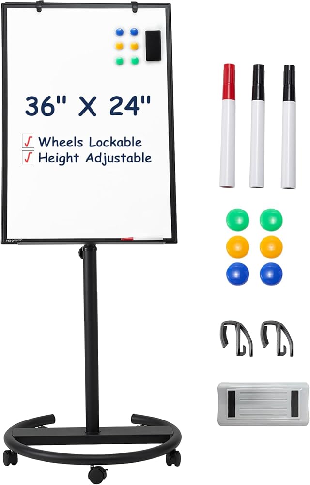 TSJ Office Mobile Whiteboard Standing - 36 × 24 بوصة لوحة بيضاء مغناطيسية ، وارتفاع لوحة بيضاء قابلة للتعديل الجافة على عجلات مع خطافات مخطط فليب