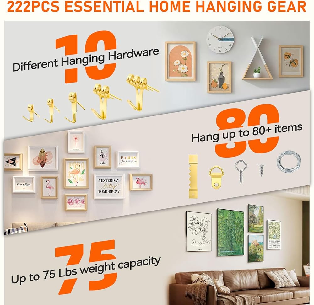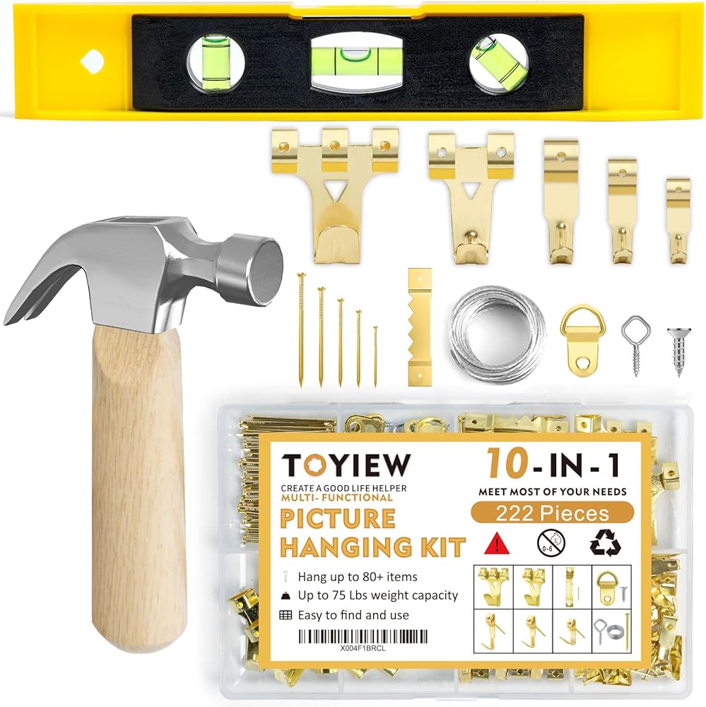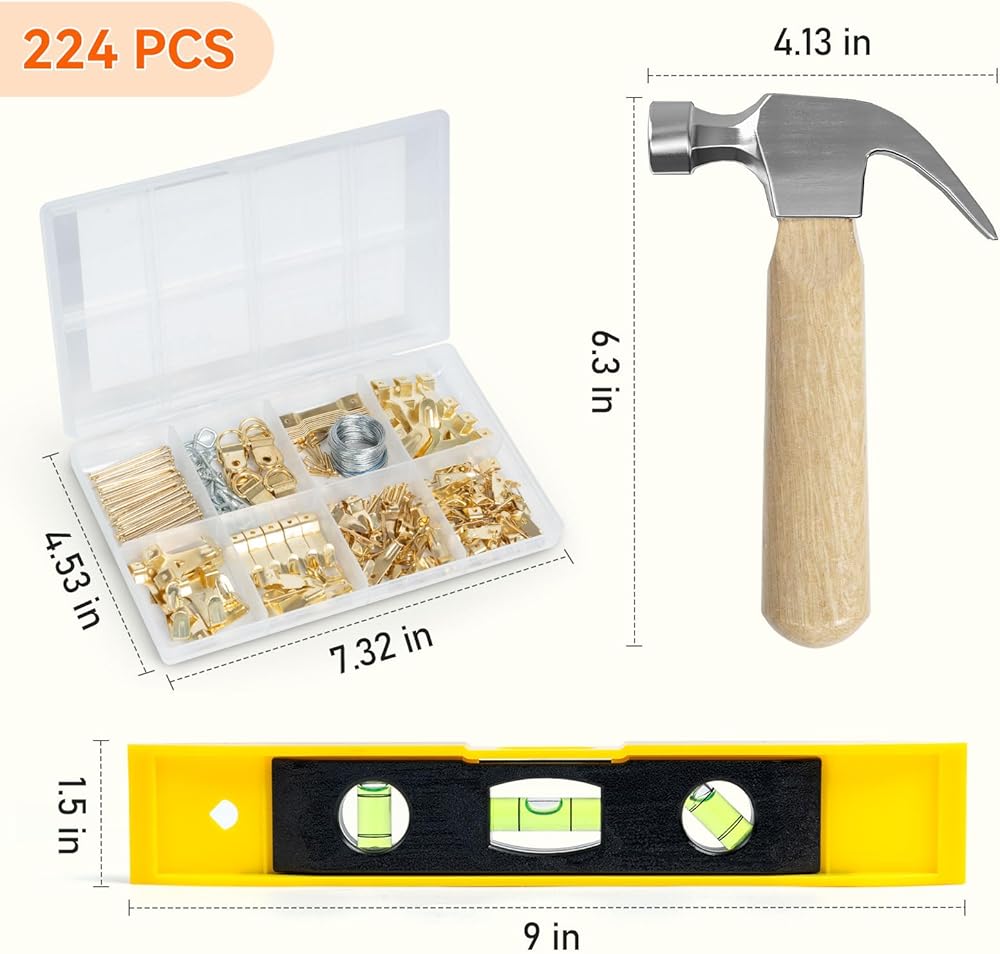 مجموعة معلقة صورة ، 224pcs معلقة أجهزة مع السنانير ، والأسلاك ، والأظافر ، وحلقات D ، وشماعات sawtooth الصور ، وخطافات حلقة ، ومجموعة معلقة إطار فن الجدار مع مستوى مغناطيسي أصفر ومطرقة مخلب صغيرة