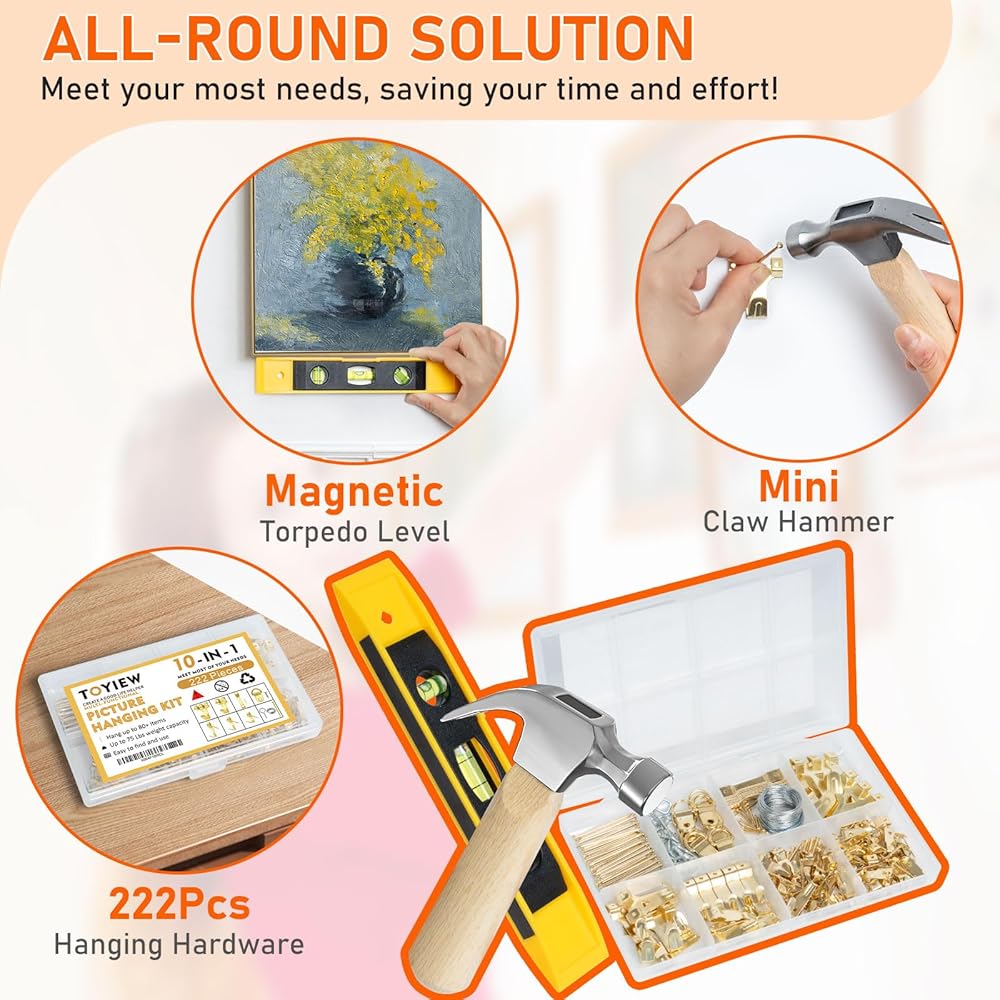 سهل الاستخدام والتثبيت: يساعد المستوى المغناطيسي المضمون في ضمان أن يكون التثبيت مستقيمًا ودقيقًا ، في حين أن المطرقة الصغيرة التي تحمل رأس مغناطيسي تتيح لك الاحتفاظ بالأظافر وتضعها بسهولة. من السهل أيضًا إرفاق السنانير والأسلاك لتثبيت آمن ومخصص. إنه حل مثالي للأشخاص الذين يرغبون في تزيين منازلهم بسهولة وراحة. مع هذه المجموعة ، يمكنك تعليق العناصر الخاصة بك بثقة وبسهولة دون الحاجة إلى مساعدة مهنية