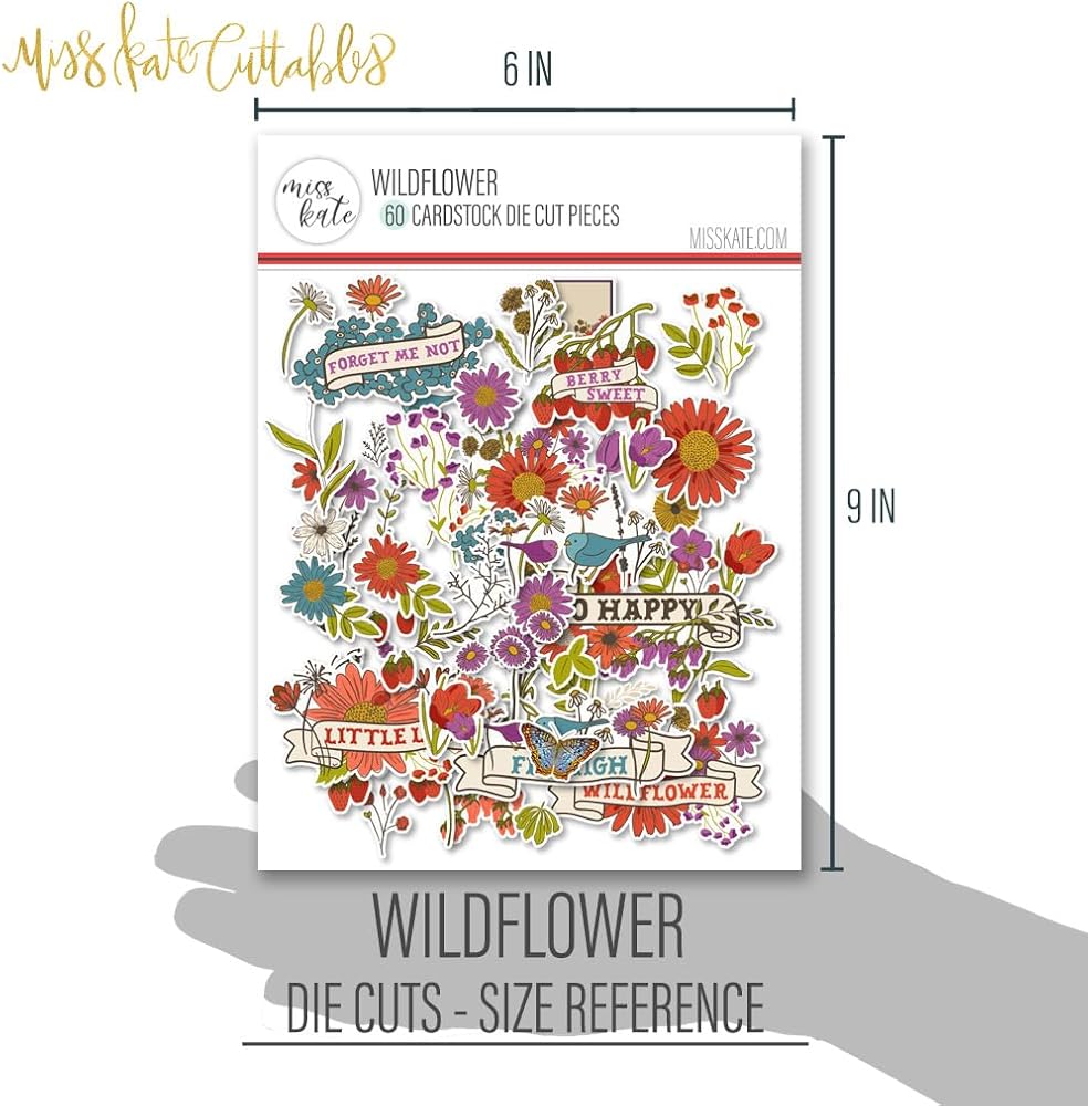 Our Wildflower Die Cuts feature designs that include Berry Sweet, Forget me Not, So Happy, Fly High, Little Lady, & Wildflower Titles, Note Cards for journaling, daisy flower strawberry butterfly bird Banner
