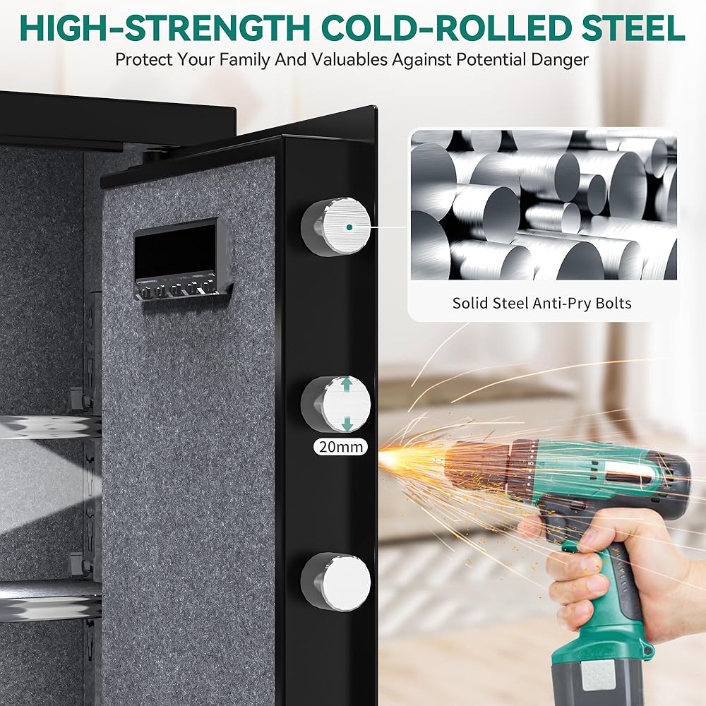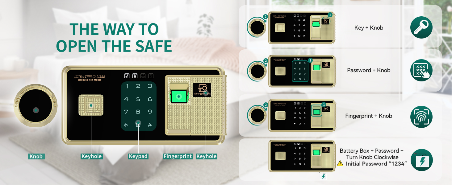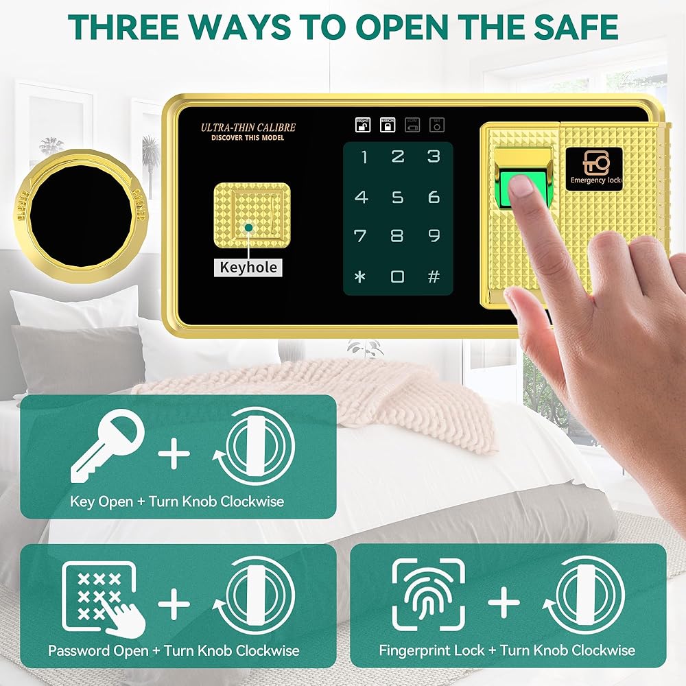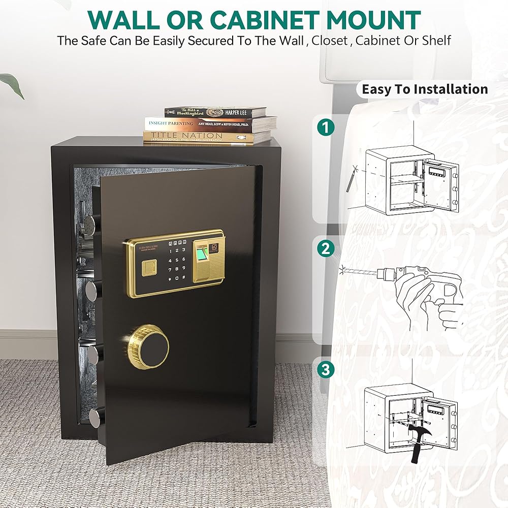 Unlock Unlock For Enhanced Security: يضم مربعنا الآمن ميزات الأمان المتقدمة ، بما في ذلك لوحة مفاتيح رقمية للوصول السريع مع كلمة مرور ، وإلغاء الإصبع ، وخيار مفتاح تقليدي ، ونظام إنذار يتم تشغيله من خلال ثلاث محاولات متكررة لمرض كلمة المرور أو خرقات قوية. تخلق المفصلات المخفية المقاومة للبري ، والقطاعات المعدنية ، والداخلية المغطاة بالسجاد قوة أمان. لضمان أمانك عند إدخال كلمات المرور ، نقدم وضع التخفي لإخفاء كلمات المرور
