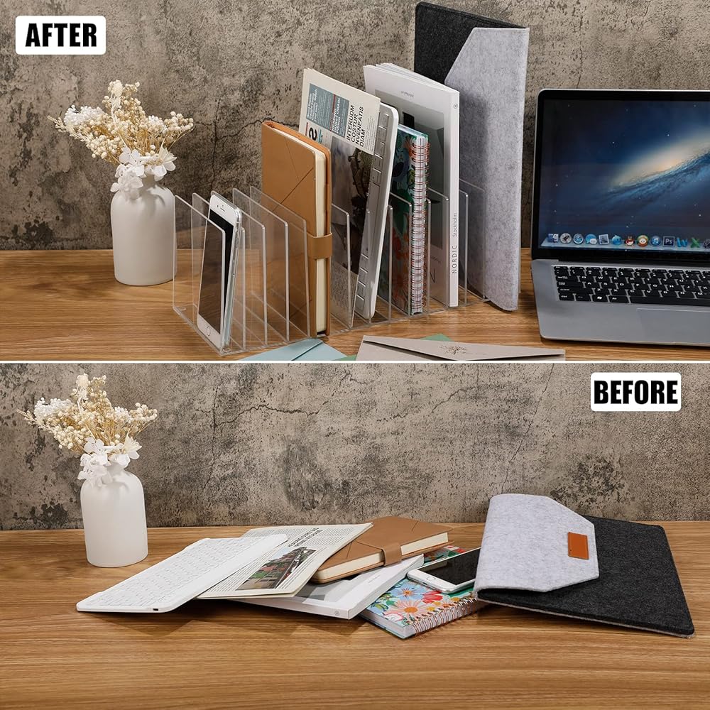 The standing file organizer for desk helps in keeping your desk clean and orderly. It is an ideal tool if you want to declutter your workspace and improve efficiency. Organize and manage your files in style with this practical yet sophisticated office accessory.