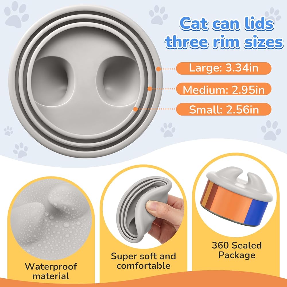 Cat Food Can Lid: this pet food can lid has three ring designs, suitable for 3 ounces, 5.5 ounces, 12 ounces and other can diameters, universal size for cats and dogs; Good sealing performance, can isolate the air, keep food fresh, prevent odor, reusable and easy to clean, when your pet can't finish the food in one go, using it is more economical and sustainable