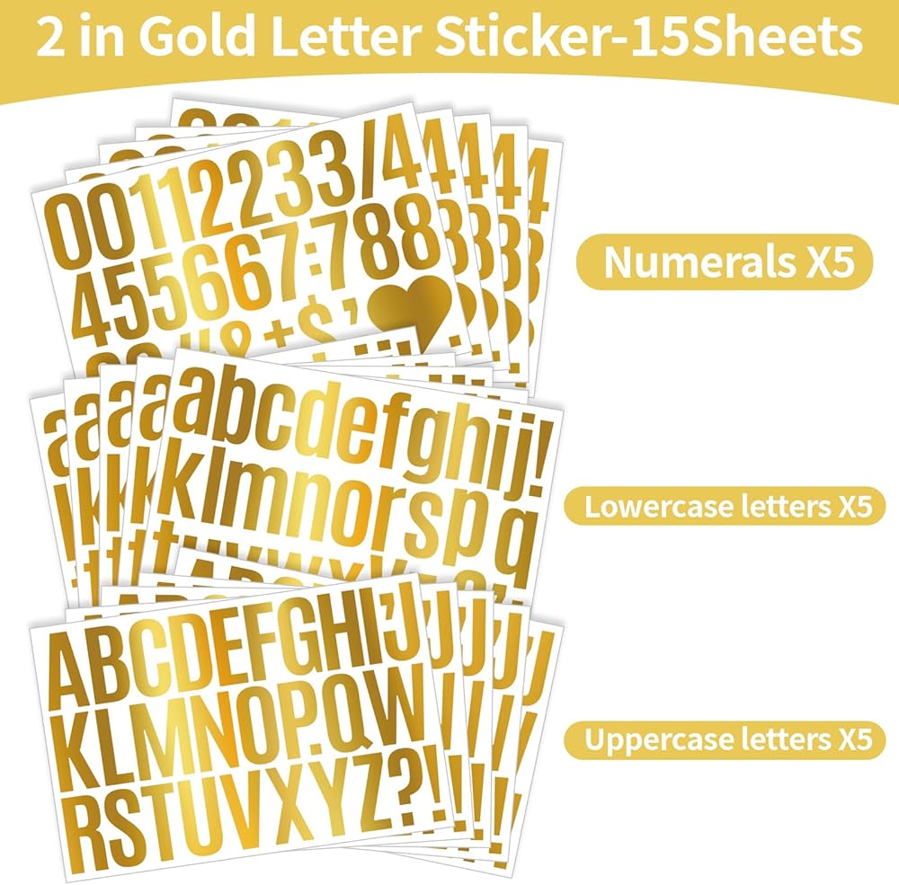 Extensive Package:Each pack contains 15 sheets, offering a total of 1425 high-quality gold letter stickers. With a height of 2 inches, these vinyl stickers feature multiples of numbers, letters, and common symbols, catering to various application needs.