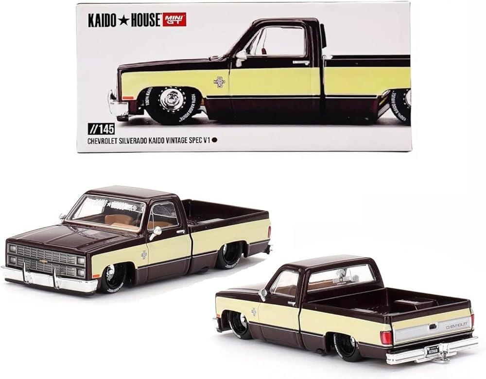 Immerse yourself in the nostalgic charm of this 1:64 scale diecast model car, a faithful recreation of the iconic Chevrolet Silverado KAIDO Vintage Spec V1. Meticulously crafted with intricate details, this collectible captures the essence of a bygone era with its two-tone brown and cream color scheme. Designed by Kaido House, a renowned name in the world of miniature vehicles, this limited-edition piece is a must-have for enthusiasts and collectors alike. Whether displayed on a shelf or added to your growing collection, this Silverado model promises to transport you back in time with its timeless appeal and exceptional craftsmanship.
