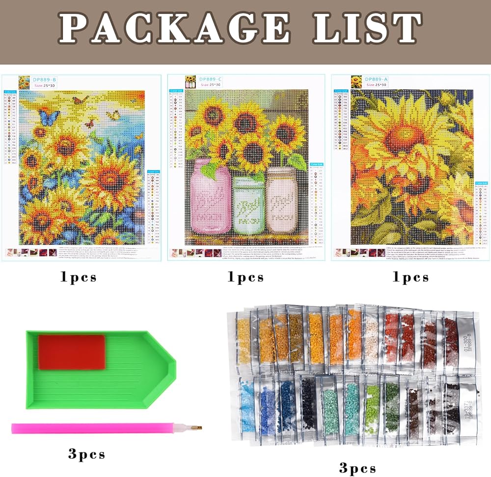 تعيين الوصف: 3 عبوات عباد الشمس مجموعة الطلاء الماس. تتضمن المجموعة حجم قماش 9.84x11.81 بوصة ، 1 * قلم الماس ، 1 * الأسمنت اللاصقة ، 1 * صينية ، حقيبة ختم ذاتية ، وماس مستدير كافي لإنشاء قطعة فن ماس مثالية لك