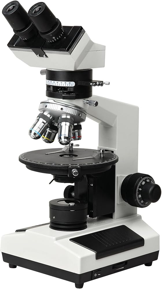 يحتوي المجهر على إضاءة سفلية (قطرية) تنقل الضوء عبر العينة لتحسين رؤية الأجسام الشفافة والشفافة. يحتوي على محلل قابل للتدوير ومستقطب يمكن أن ينزلق داخل وخارج المسار البصري. يوفر مصدر ضوء الهالوجين ضوءًا ساطعًا في مسار مركّز، ويتحكم المتغير المتغير في كمية الضوء المنبعث من المصباح. يمكن ضبط مكثف آبي للتحكم في مسافة الضوء من المسرح، ويحتوي على غشاء قزحي لتحسين كمية الضوء التي تضيء العينة. تدور المرحلة المستديرة لوضع العينات، ويتم تدرجها بزيادات قدرها درجة واحدة. يتم دمج مقابض التركيز الخشنة والدقيقة المحورية لتسريع التركيز للمشاهدين الذين يستخدمون اليد اليسرى واليمنى.