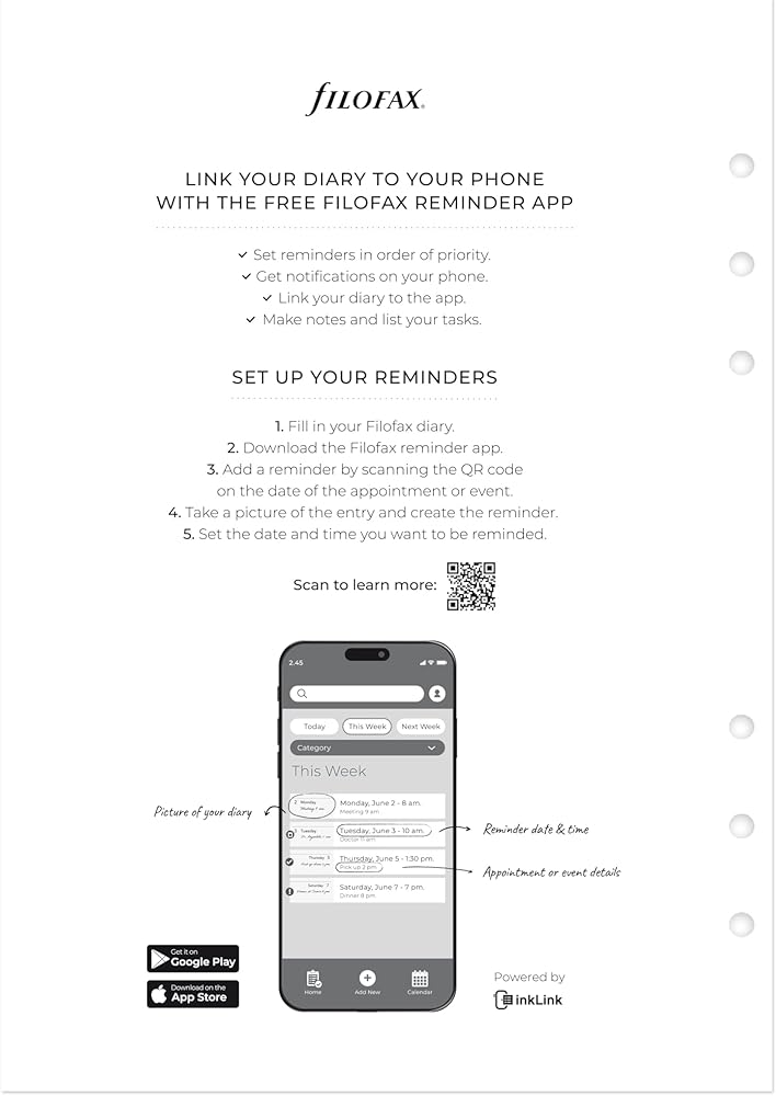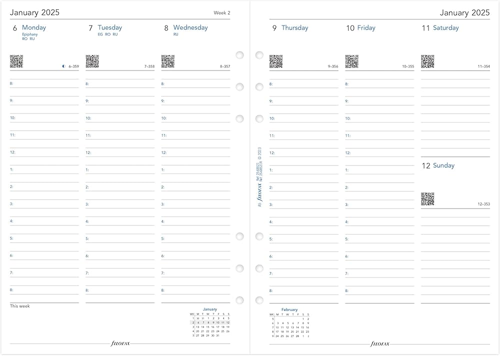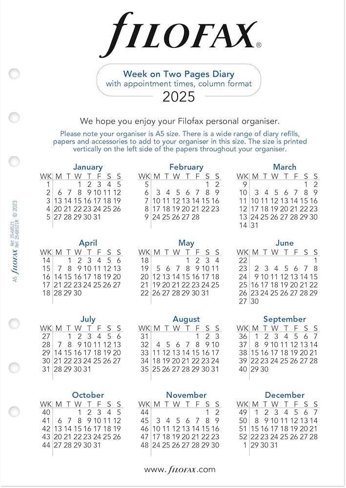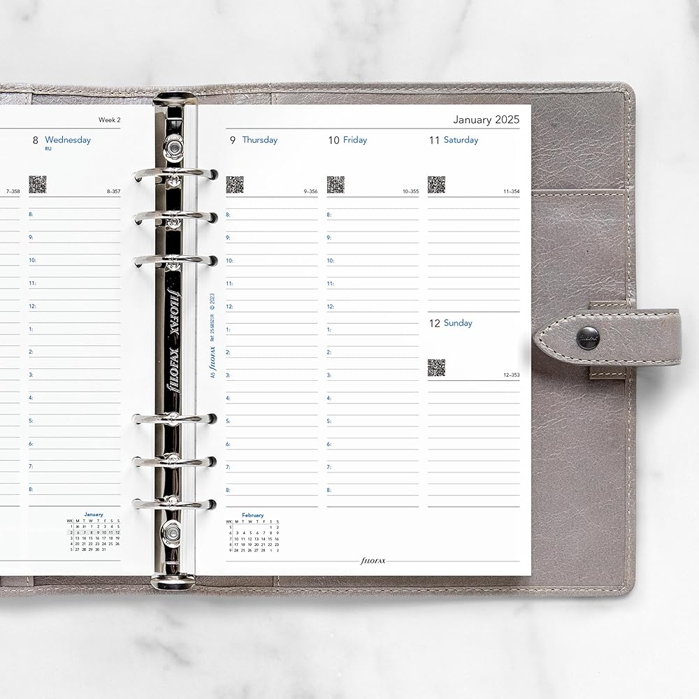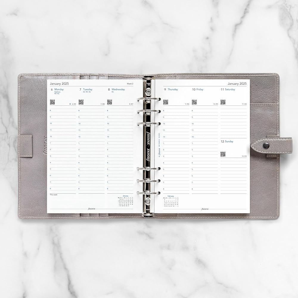 Organize the week at a glance with this A5 week on two pages diary with appointment times. Calendar Diary Refill features: Week-to-View (WTV), Week on two pages with appointments, January to December, 2025. Weekday hourly appointment schedule from 8:00 a.m. to 8:00 p.m. White 80 gsm fountain pen-friendly paper. 64 sheets printed with black and blue ink. Vertical layout. Weekly dated refill is A5 size for planners, organizers, agendas and diaries. English. The future of planning is here. Plan, scan, click and go with Filofax® Organizers featuring Plan & Link™. Download the free Filofax® Reminder app, powered by InkLink™ technology, from the App Store and Google Play. Over the years, the Filofax organizer has evolved from a simple loose-leaf system into an indispensable everyday accessory. The Filofax logo promises authenticity and the finest craftsmanship. It's a hallmark of impeccable quality, trusted worldwide, since 1921.