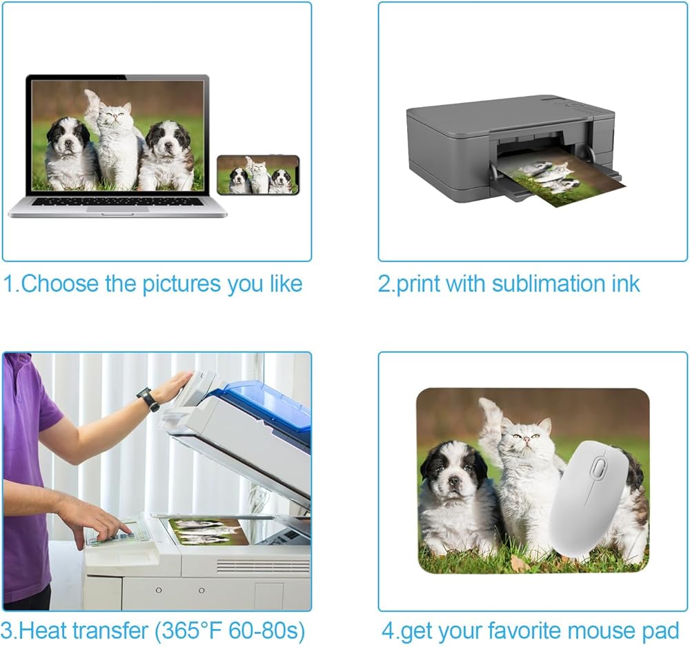 Personalize Sublimation Mouse Pad: Our sublimation mouse pad blanks is made of high quality soft ruber material. The size of sublimation mouse pad is 20x24x0.3cm/9.4" x 7.9" x0.12". Can be printed any personal photos, animated characters, and other images you like.Use these blank sublimation pads to personalize your mouse pad.