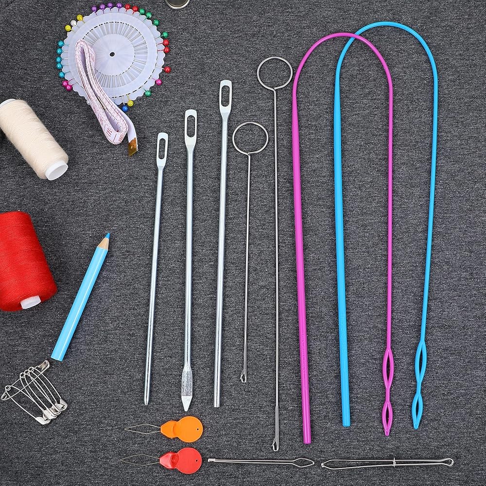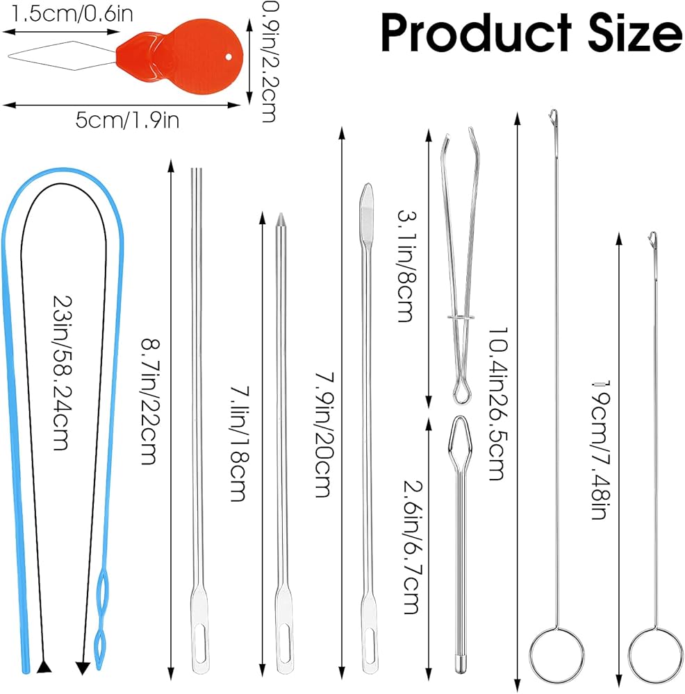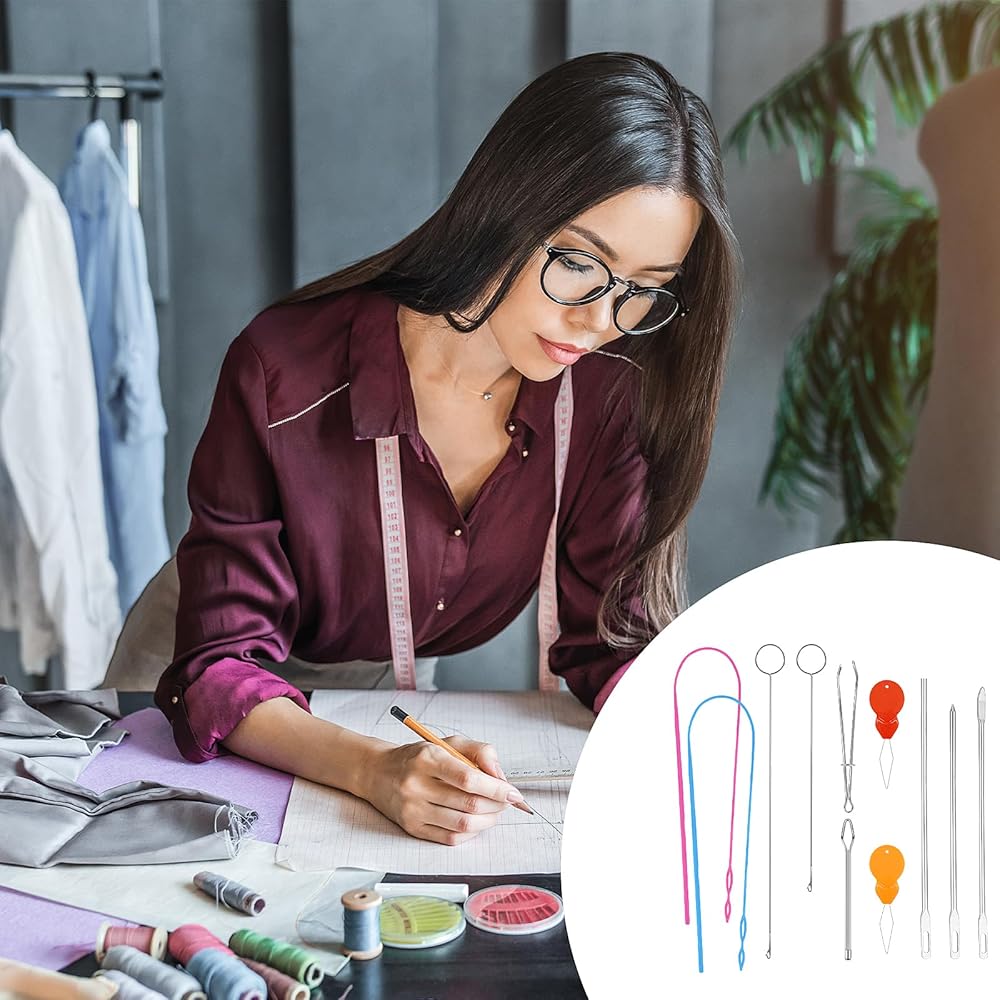 Package Included: The drawstring threader tool set includes 2 plastic flexible cord threaders, 3 metal threaders, 2 gourd-shaped needle threaders, 2 tweezers and 2 loop flip hooks with latches, a total of 11 sewing tools.