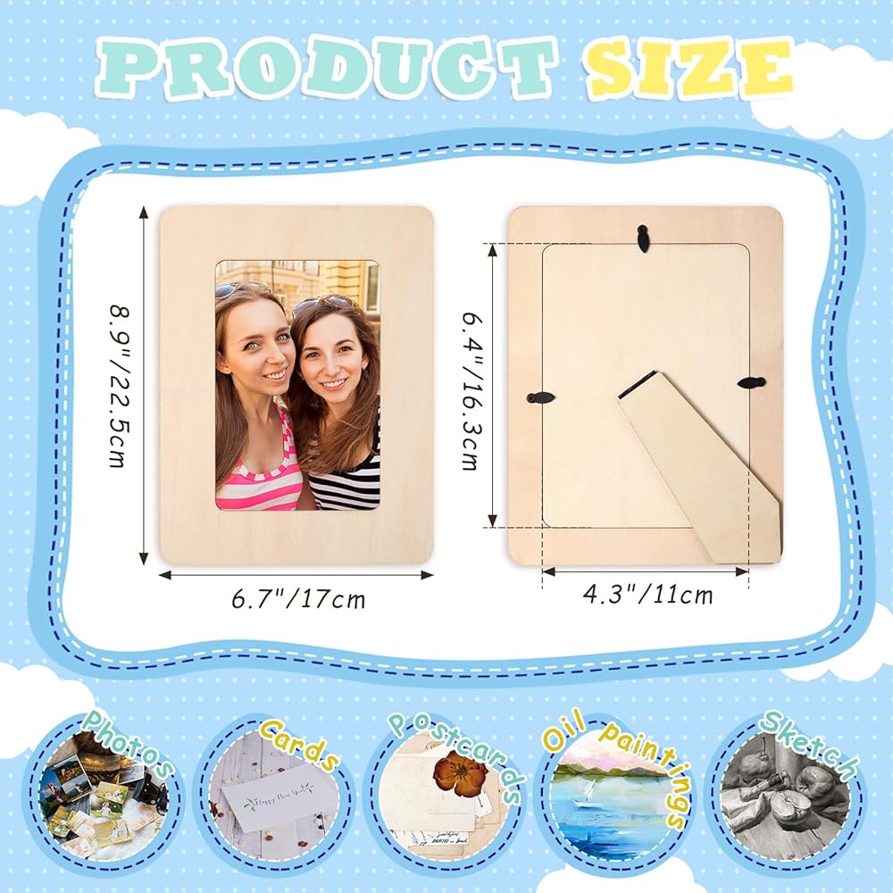 Package Includes: you will get 15 packs of blank unfinished wooden picture frames, with an outer size of 6.7 x 8.9 inches/ 17 x 22.5 cm, and an inner size of 4.3 x 6.4 inches/ 11 x 16.3 cm, suitable for photos or cards with a length of 6.4 to 8.9 inches and a width of 3.5 to 6.7 inches