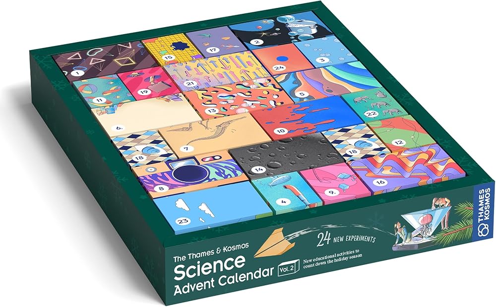 The 2024 version of The Thames & Kosmos Science Advent Calendar. ‘Tis the season for science! Christmas time is experimentation time. Discover something new and amazing every day leading up to the holiday. With this advent calendar, children open a new box each day to find new equipment or materials and the instructions for a science experiment. The experiments can be done quickly and only require additional items that are commonly found in every household. Each of the 24 beautifully designed boxes includes unique experiment materials and expertly written and illustrated instructions.