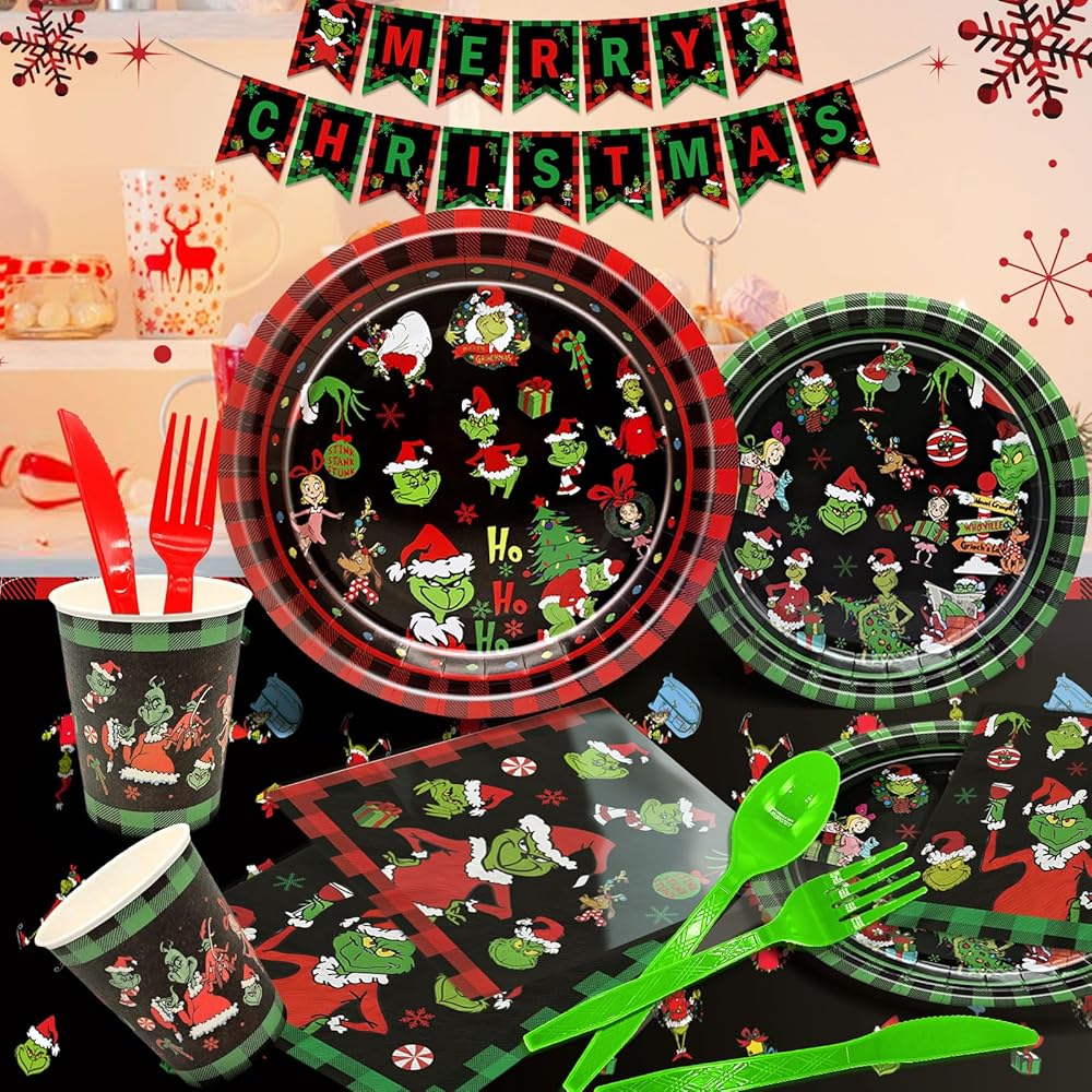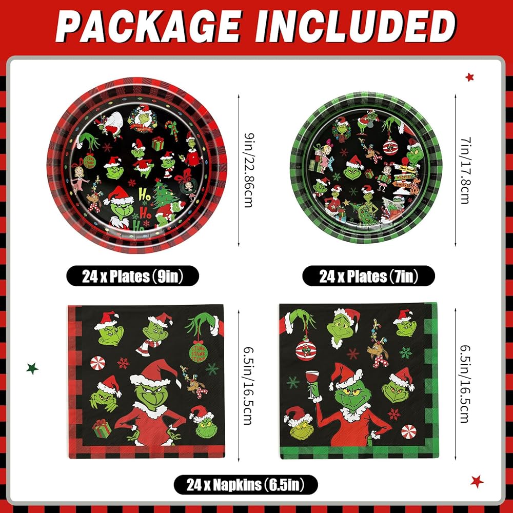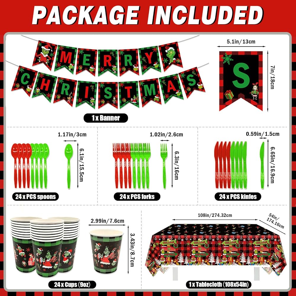 تشمل الحزمة: 1*"Merry Christmas" Banner Christmas ، 24*7 "لوحات أوراق عيد ميلاد مجردة ، 24*9" لوحات أوراق عيد ميلاد مجردة ، 72*ملاعق بلاستيكية ، شوكات ، سكني ، 24*مناديل عيد ميلاد سعيد ، 24*أكواب الورق ، 1*مقرز عيد ميلاد سعيد.