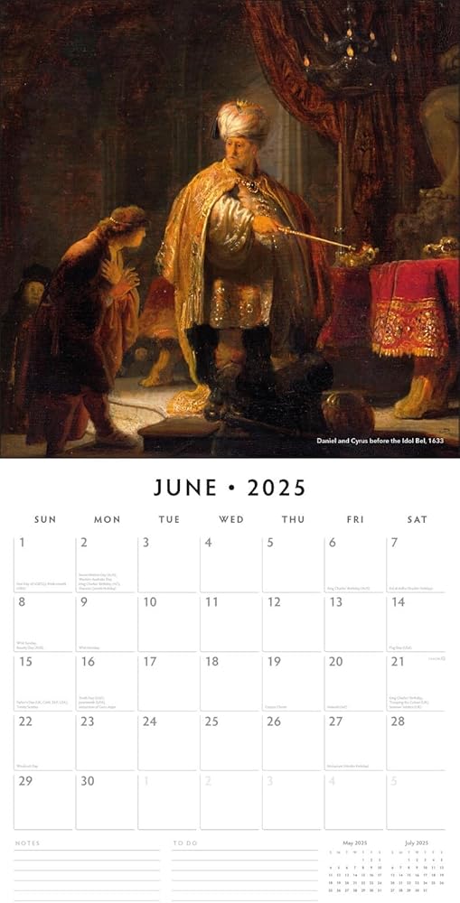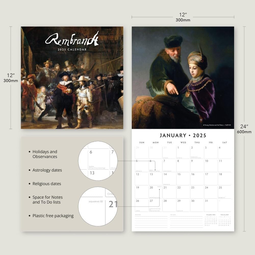 Discover the dramatic mastery of Rembrandt van Rijn with the 2025 'Rembrandt' wall calendar. Sized at 12" x 24" open and printed on premium thick & sturdy paper, this calendar highlights the rich, textured works of one of the greatest painters of the Dutch Golden Age. Renowned for his use of light and shadow, Rembrandt's portraits, landscapes, and historical scenes evoke deep emotion and timeless beauty. Each month features one of his iconic works, from his masterful self-portraits to the dramatic chiaroscuro of “The Night Watch,” showcasing his unparalleled ability to capture the human soul.