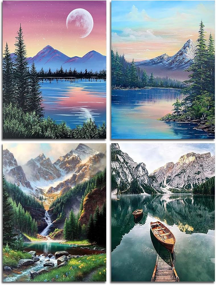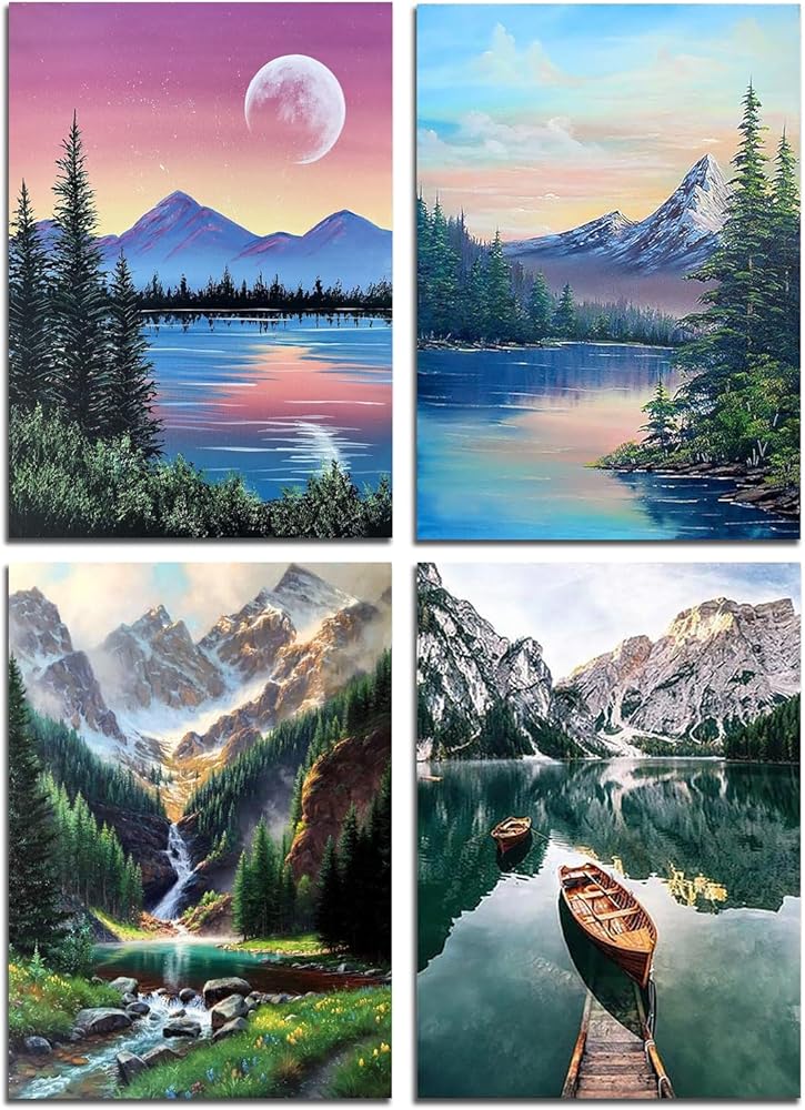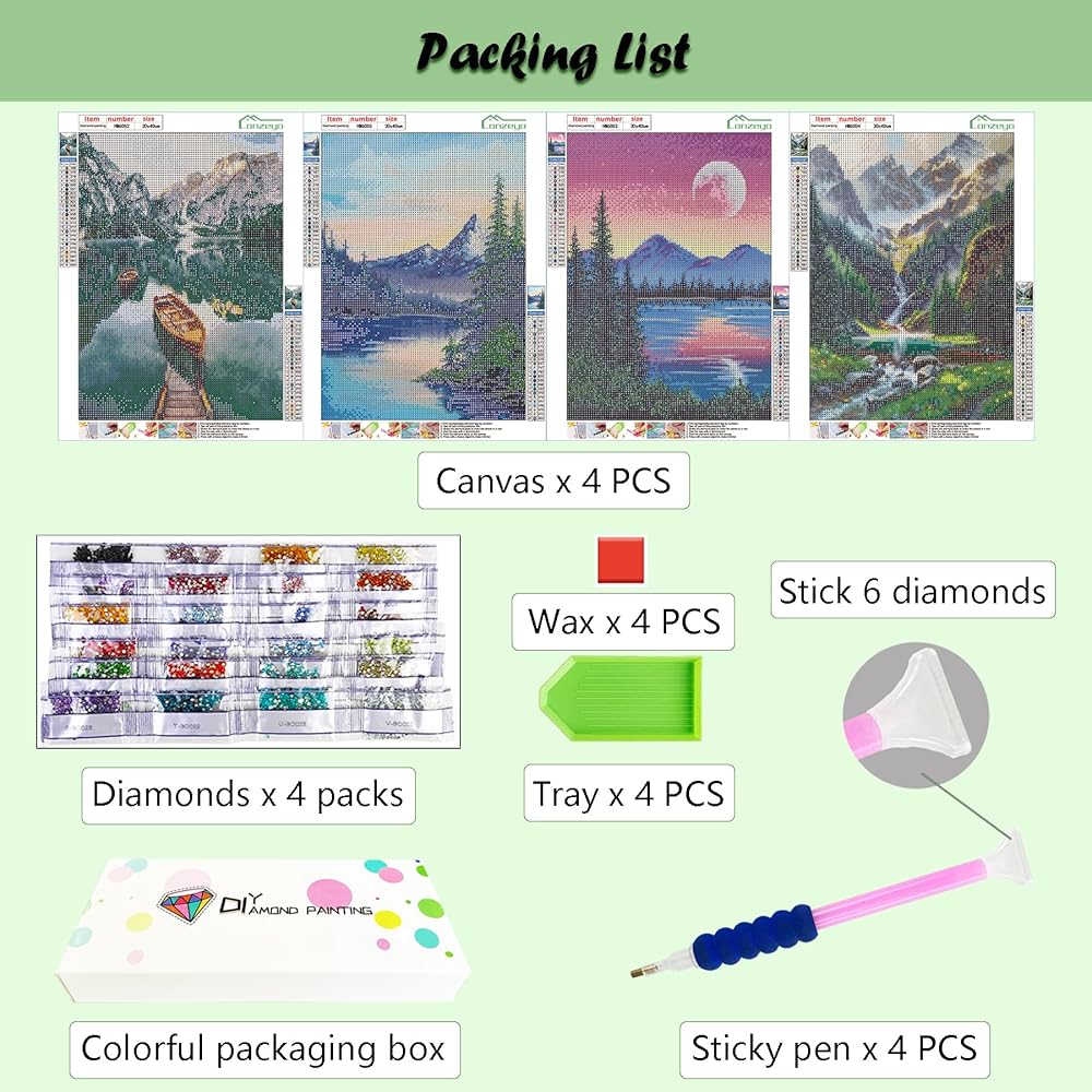 قائمة التعبئة-4 مجموعات اللوحات الماس 5D ، بما في ذلك 4 قماش ، 4 عبوات من الماس ، 4 أقلام دايموند لزجة ، 4 طين لاصق ، 4 لوحات الماس والتعليمات ، لا إطار. سيكون هناك 20 ٪ من الماس من كل لون.