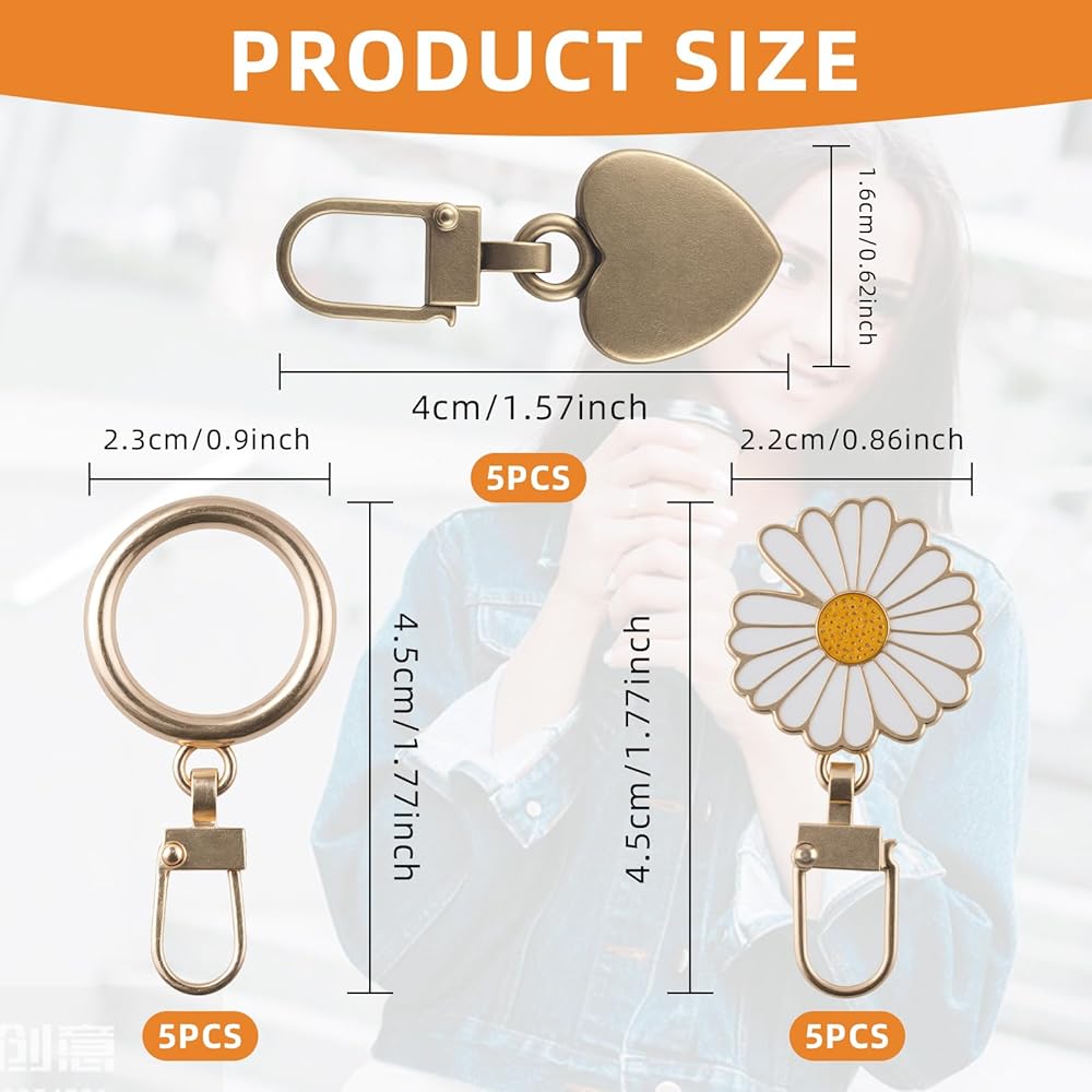 This set includes 15 multicolor zipper pulls in three charming designs—heart, daisy, and circle shapes. Perfect for adding a stylish and personalized touch to your belongings!
