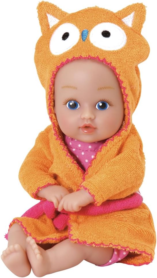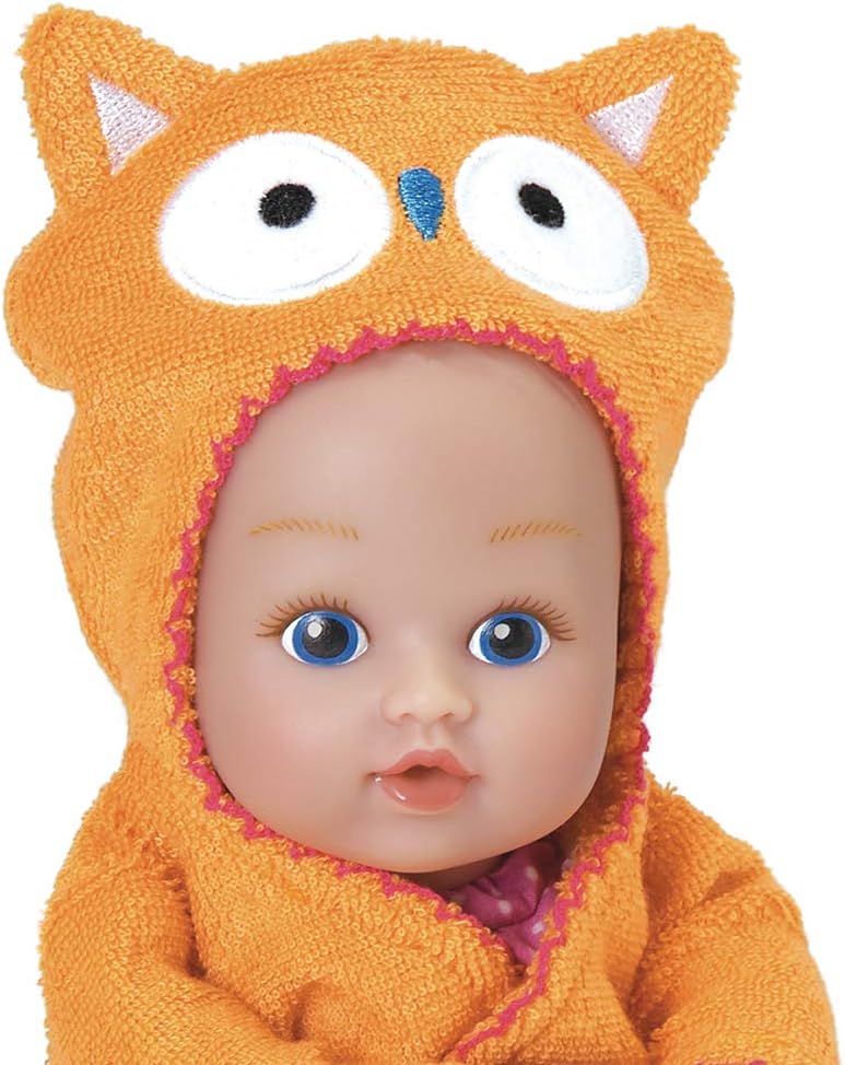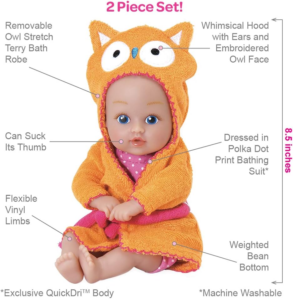 • 3-PIECE SET - This Adora baby doll and accessories set comes with one 8.5-inch baby doll, an attached light pink polka-dot swimsuit, and an embroidered hooded Ducky