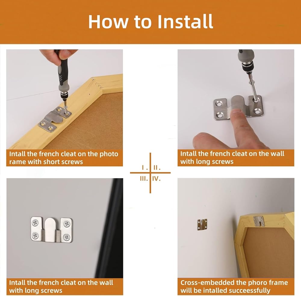 • 【Simple Installation】 First, the plastic expansion screw is embedded in the wall, then the hook is fixed on the wall with long screws, and then another hook is fixed on the back of the photo frame (other furniture items) with short screws, and then the hook on the photo frame is inserted into the hook on the wall.