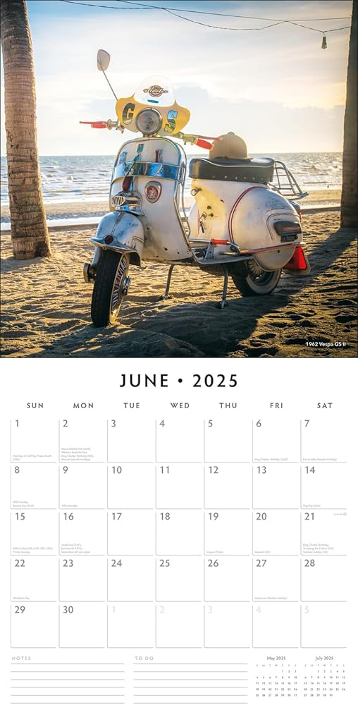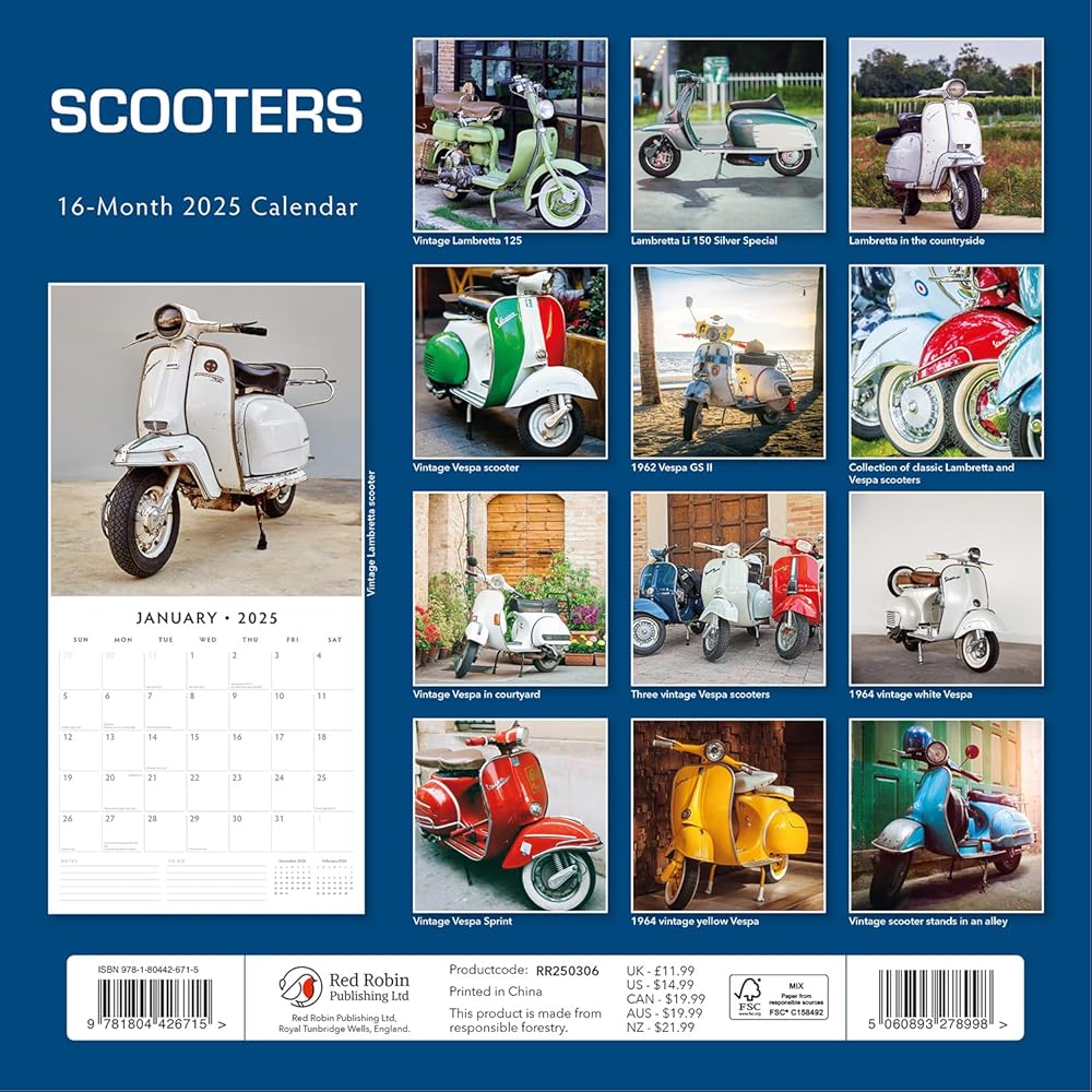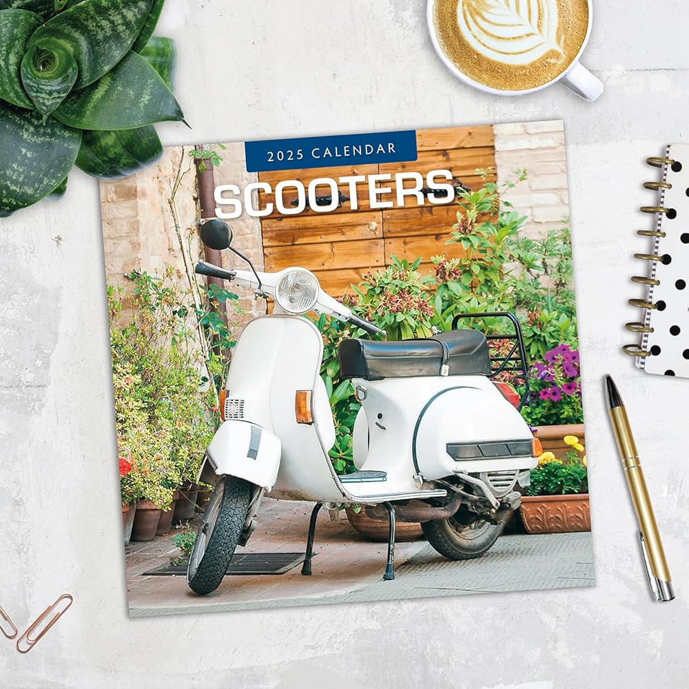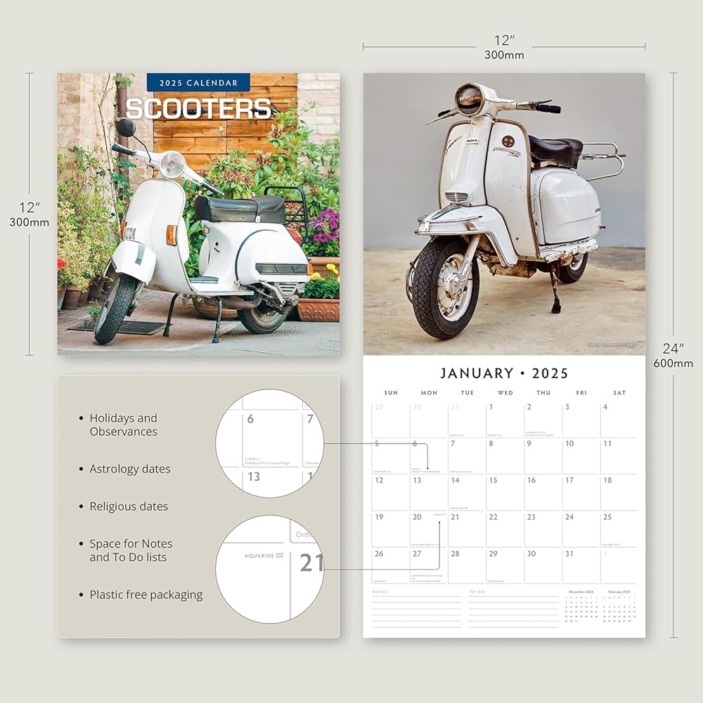 In addition to its charming visuals, this calendar includes key features such as holidays and observances, astrology dates, religious events, and plenty of space for notes and to-do lists. The 2025 'Scooters' calendar is perfect for scooter aficionados and city adventurers, helping you stay organized while celebrating the spirit of two-wheel travel.