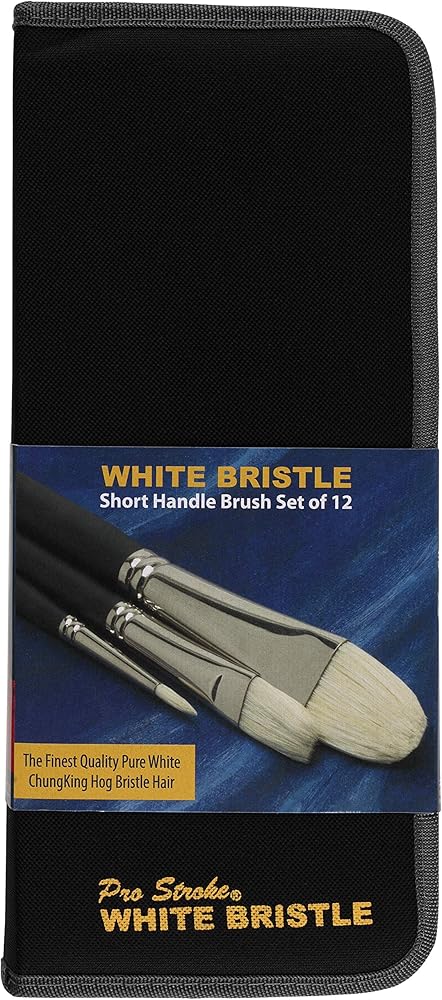 Creative Mark pro stroke white bristle short handle Paint brush set with case. Embrace new brush technological advances. Artist Paint brushes are Natural inwardly curving with flagged tips for full Paint stroke. The Professional Paint brushes bristles are Chungking hog hair bristle that gives optimal stroke with traditional oils, acrylics, caseins and alkyds. Our Paint brushes set has a short handle with seamless nickel-plated ferrules glued and crimped onto matte handles. These 12 Painting brushes comes in a black zippered case for keeping your brushes Organized and are ideal as introductory kit for hobbyists and Professionals alike. This Paint brush case is lightWeight and easy to carry making them Ideal For Travel or outdoor art. 12 pieces of Paint brush set for acrylic Painting Sizes Includes, rounds Size 1, 2 and 6. Bright Size 2 and 6. Flat Size 4, 10 and 12. Filberts Size 1, 4, 8 and 12.