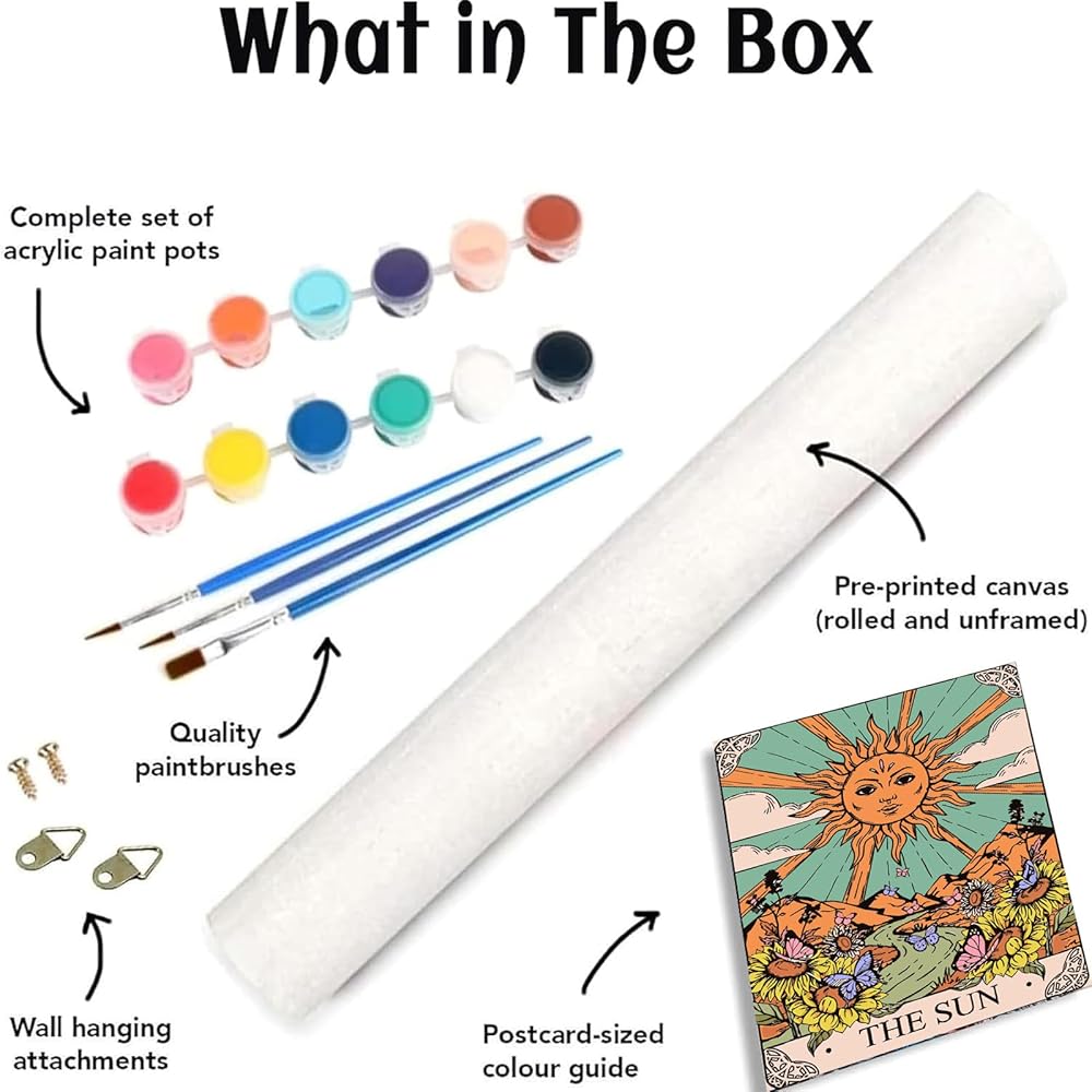 • What You Will Get - 1 pack painting canvas on frame, 1 set of acrylic paint, 2 high-quality brushes, 1 color postcard guide for reference, all packaged in a paper box.