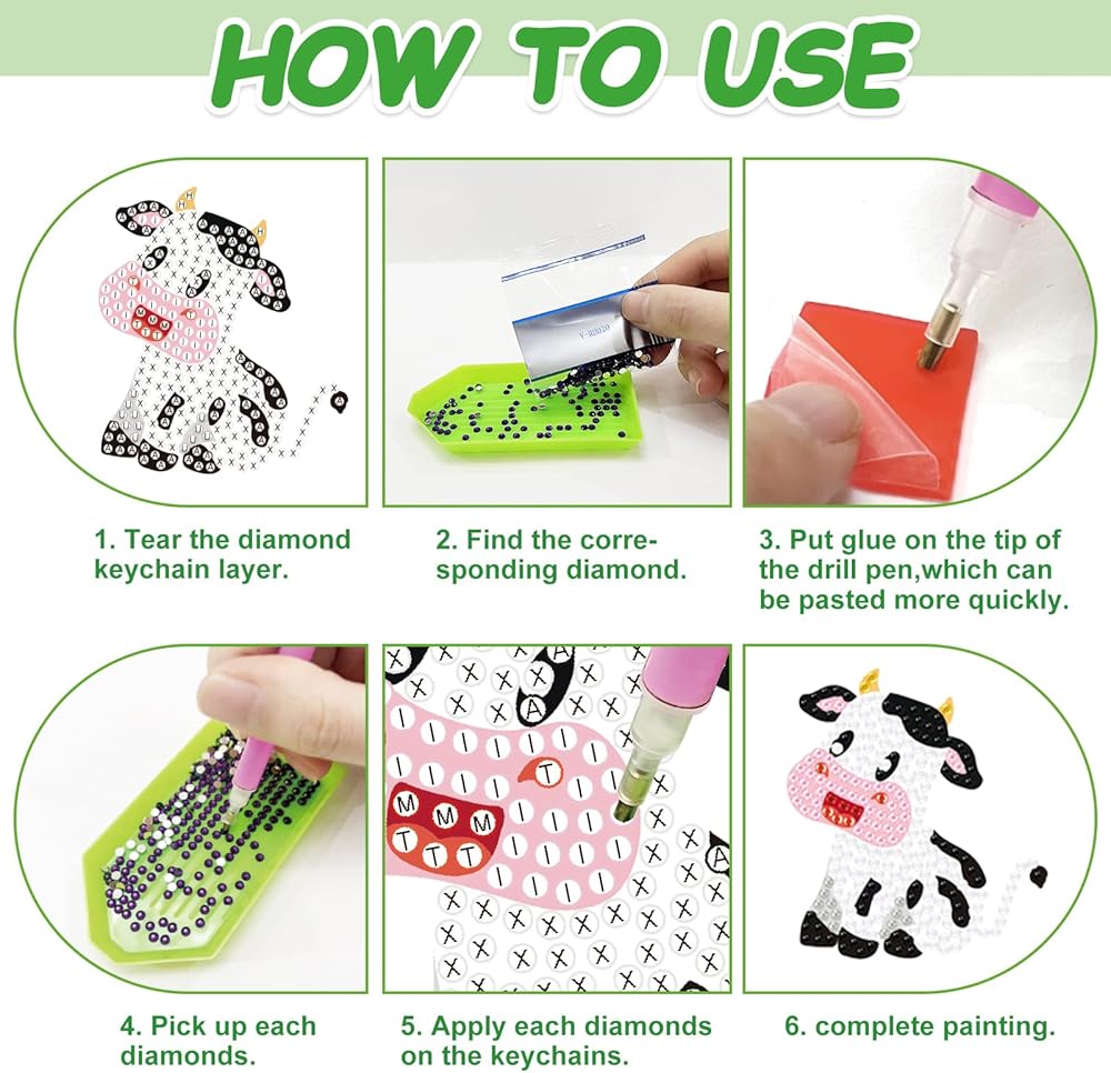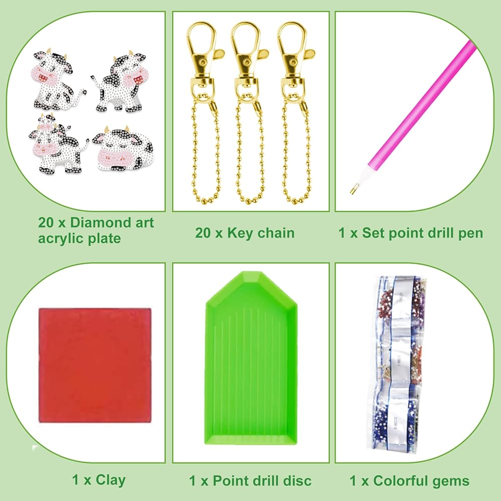تشمل المنتجات: ستتلقى 20pcs مجموعة مفاتيح مفاتيح Cow Diamond ، والتي تشمل 20 ٪ من لوحة أكريليك فن الماس ، بقياس 2.32 × 2.91 بوصة ~ 3.94 × 2.36 بوصة ، وسلسلة مفتاحية 20pcs ، و 1pc Point Drill Pen