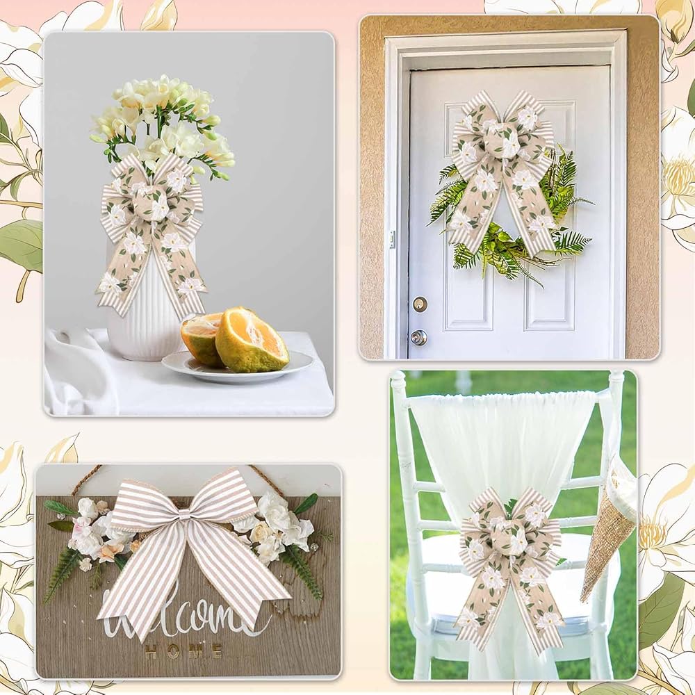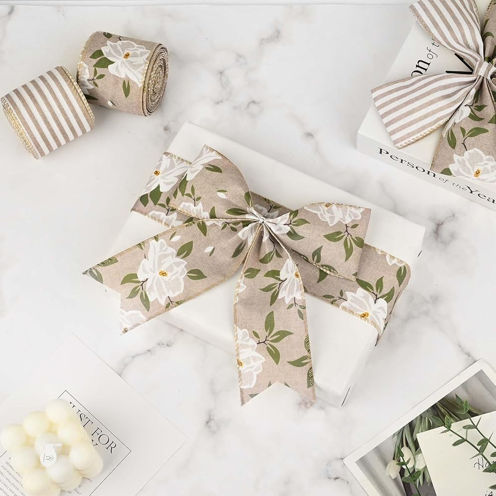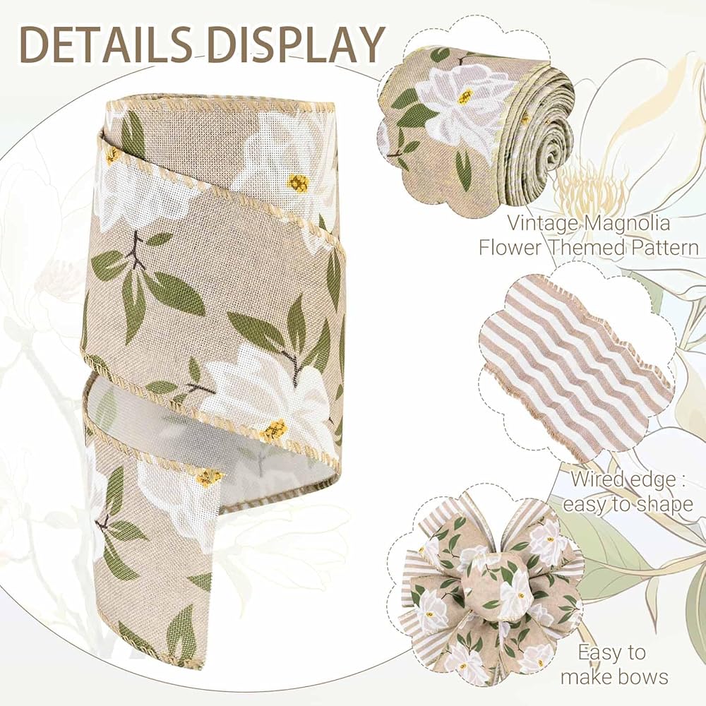 Vintage Magnolia Design: Our flower ribbons printed with magnolia flowers, leaves and stripes, mainly in flaxen and white, are very classic and elegant holiday decorations, beautiful and fresh, suitable for many uses.