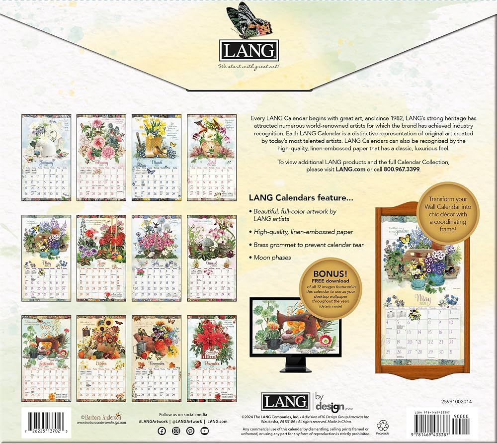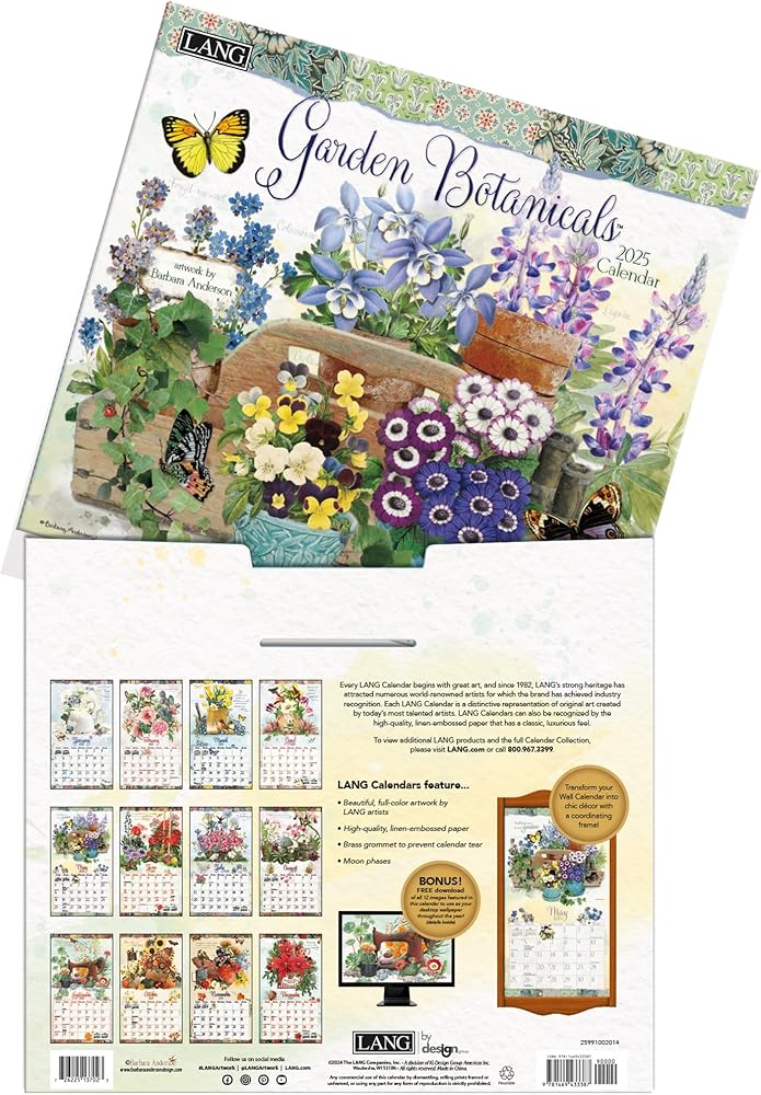 Everyday planning meets beautiful art in the Garden Botanicals 2025 Wall Calendar, featuring artwork by Barbara Anderson. Complete with all the beautiful and practical features you expect from LANG wall calendars, this high-quality calendar includes a matching linen-embossed gift sleeve and a brass hanging grommet to prevent calendar tears. Desktop wallpaper download available.