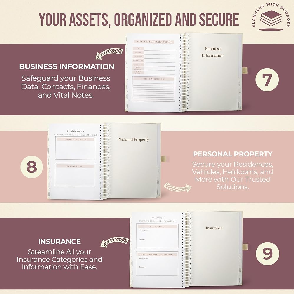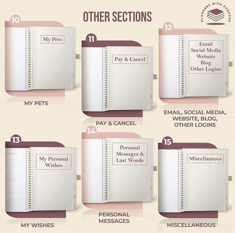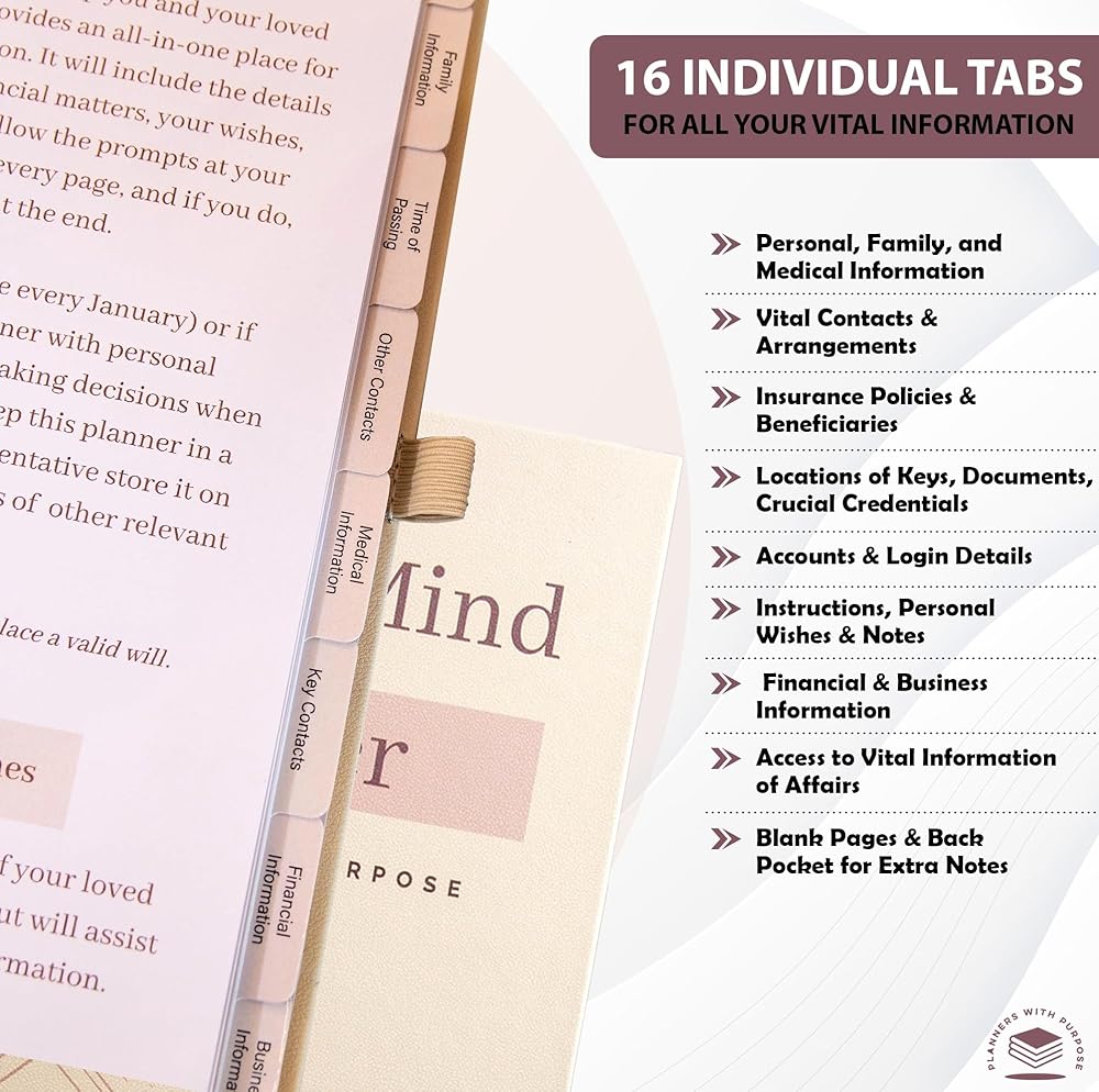 Simple & Complete Life Organizer: يتضمن مخطط راحة البال لدينا 16 قسمًا منظمًا مع مطالبات لتسجيل التفاصيل الطبية والأصول المالية والممتلكات والمستفيدين والحسابات النشطة دون عناء. تم تصميمه من أجل الوضوح والسهولة ، فهو يساعدك على إنشاء خطة شاملة ويمكن الوصول إليها لأحبائك.