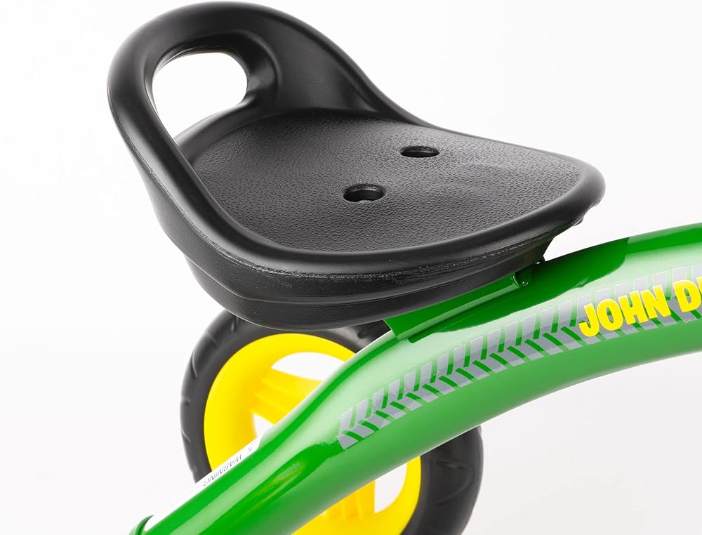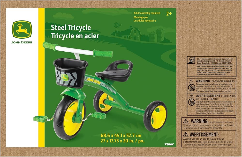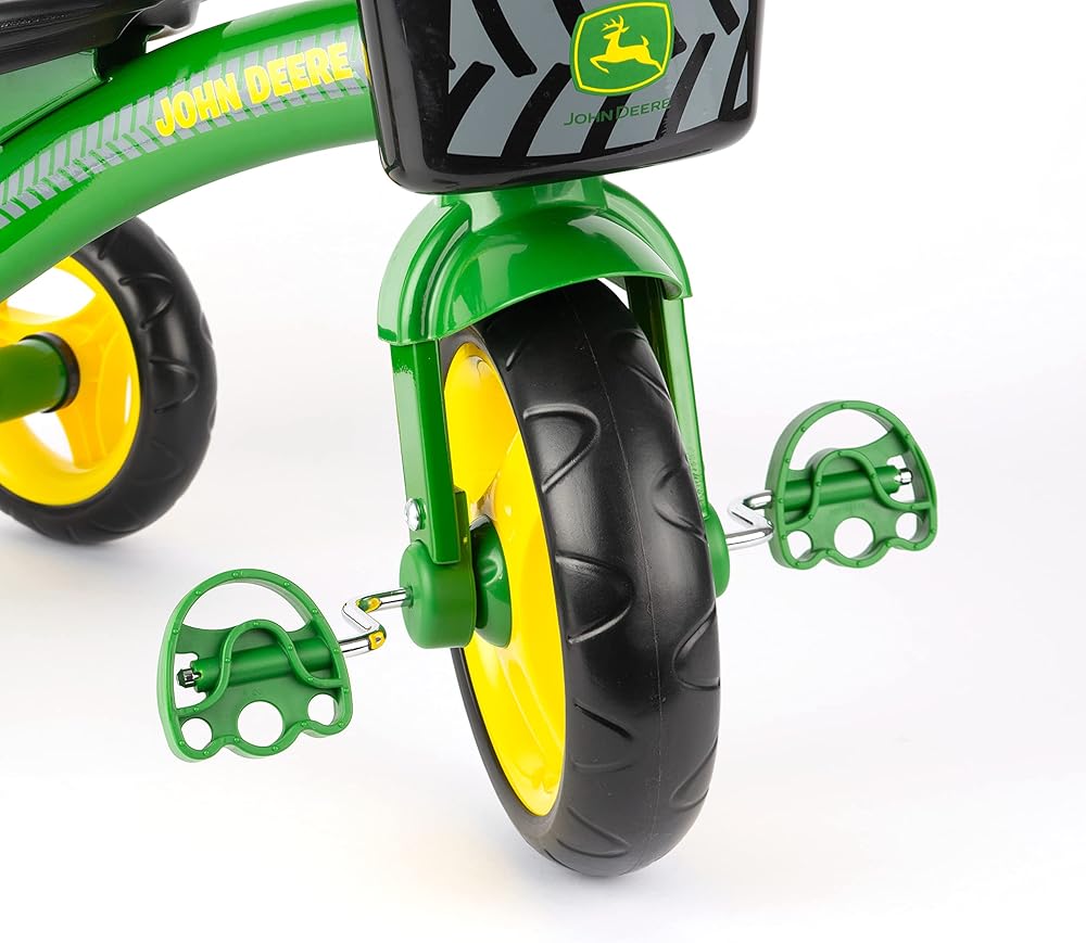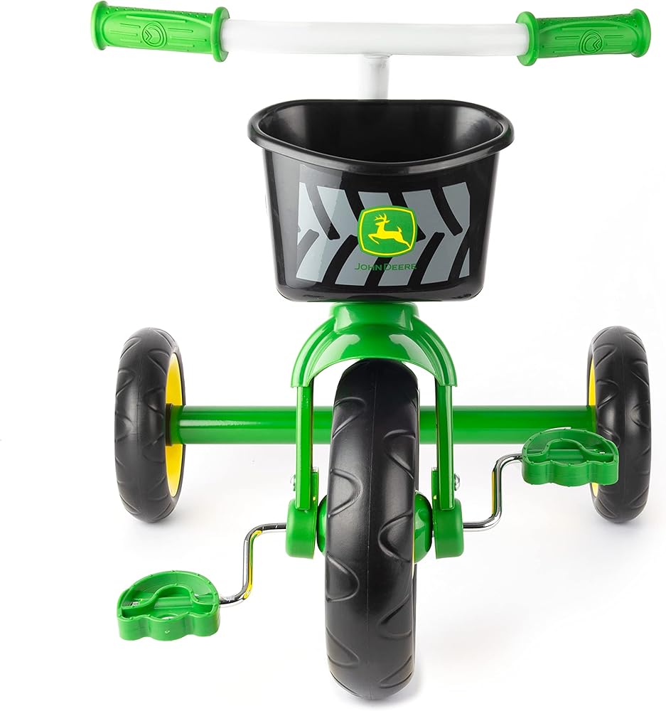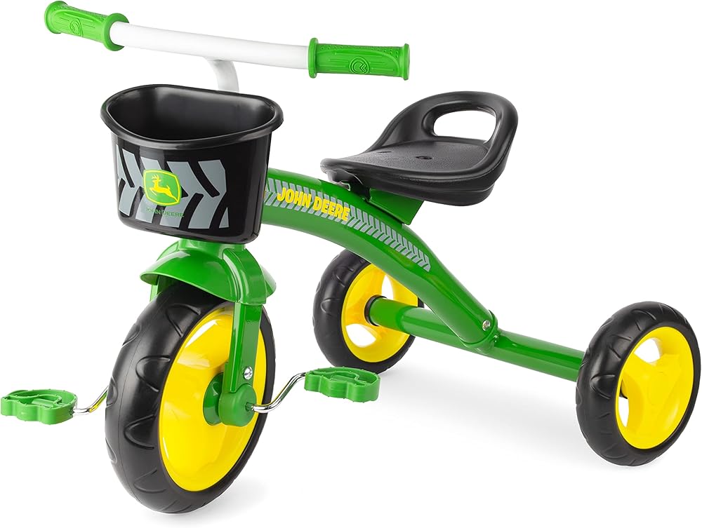 Driveways and sidewalks pave the way to exploration on this classic tricycle. Boys will the John Deere green frame and yellow wheels. The rear storage basket lets your child take the little items he will need as she goes along the way. This John Deere tricycle is constructed of heavy duty steel, has an adjustable seat and controlled steering for riding stability. Weight limit 37 lbs.