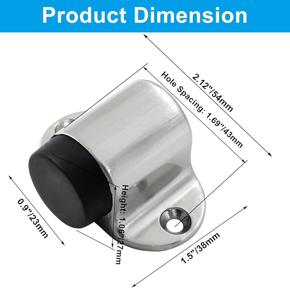 Package Included: Pack of 2, Floor Mount Door Stop with mounting screws included. Size: 2.12" x 1.5" x 1.06"/54mm x 38mm x 27mm (L*W*H), Hole Spacing: 1.69"/43mm, Diameter: 0.9"/23mm.