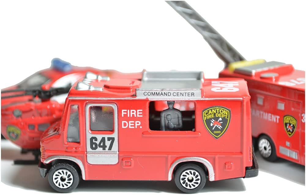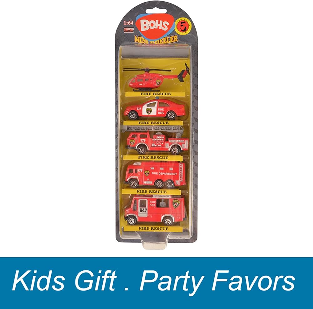 بي او اتش اس سيارات سباق وانقاذ في حالات الطوارئ - نموذج مصغر معدني مصغر - شاحنة إطفاء سلم جوي، طائرة هليكوبتر انقاذ، محرك اطفاء خزان مياه، سيارة دورية، مركز القائد (عبوة من 5 قطع)