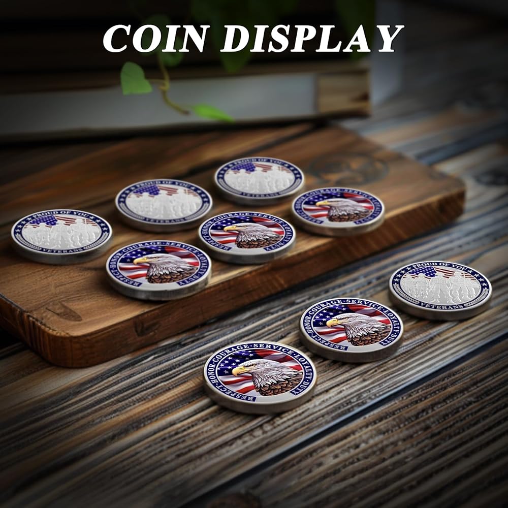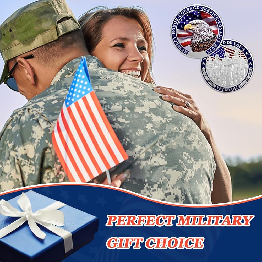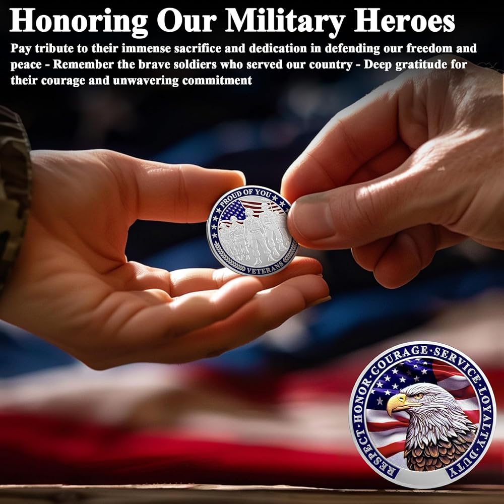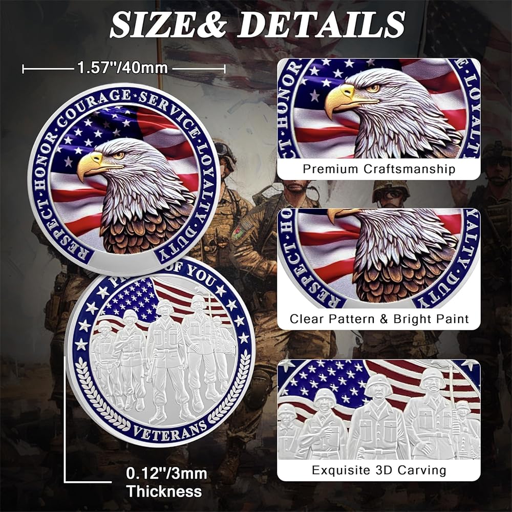 • التصميم الأمامي: تتميز العملة العسكرية بنسر أصلع مهيب في المركز ، يرمز إلى القوة والحرية كشعار للولايات المتحدة. تعرض الخلفية العلم الأمريكي ، والكلمات - "الاحترام" ، "الشرف" ، "الشجاعة" ، "الخدمة" ، "الولاء" ، و "الواجب" - المضي قدماً في القيم الأساسية التي يجب على الجنود تجسيدها. ينقل الاعتراف العالي للمجتمع بخدمة المحاربين القدامى وتضحياتهم ، مع التأكيد على امتنان الأمة واحترامهم لهم